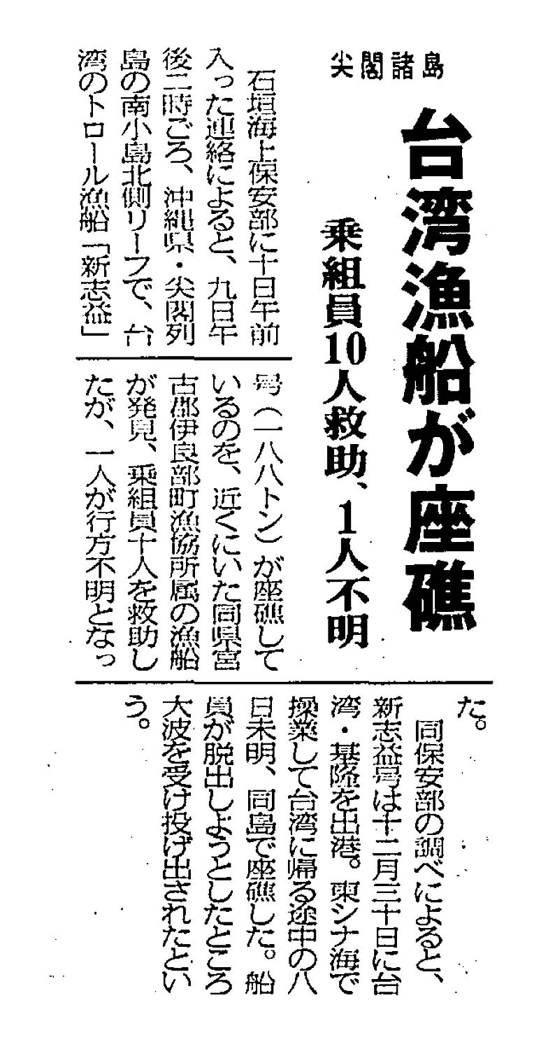 > 尖閣諸島/台湾漁船が座礁/乗組員10人救助、1人不明:
