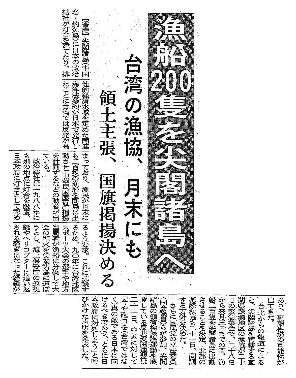 > 漁船200隻を尖閣諸島へ/台湾の漁協、月末にも/領土主張、国旗掲揚決める: