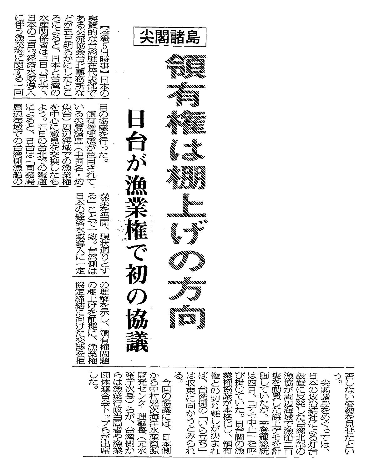 尖閣諸島/領有権は棚上げの方向/日台が漁業権で初の協議