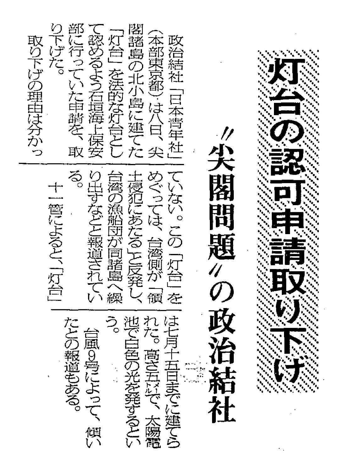 灯台の認可申請取り下げ/”尖閣問題”の政治結社