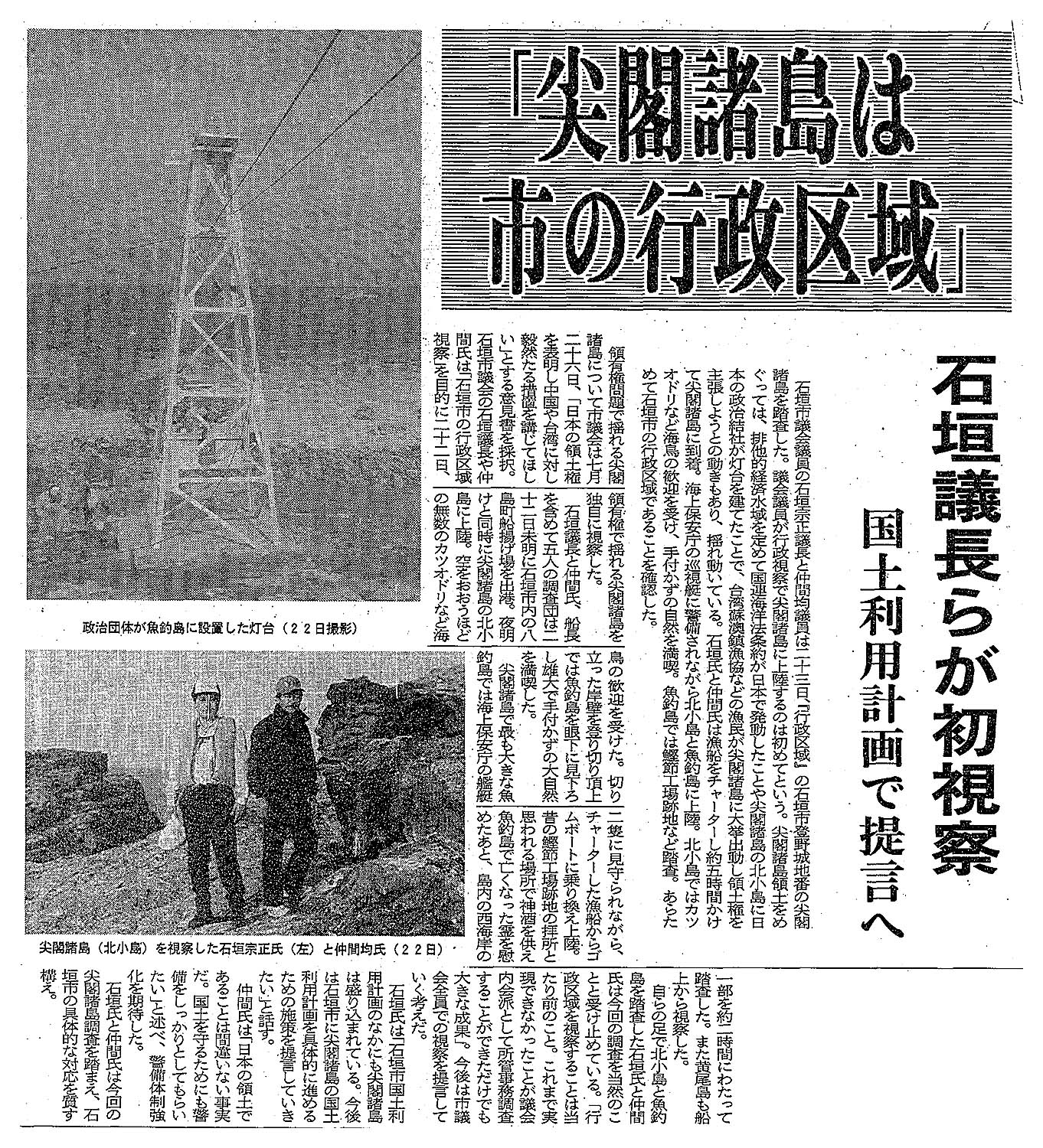 > 「尖閣諸島は市の行政区域」/石垣議長らが初視察/国土利用計画で提言へ: