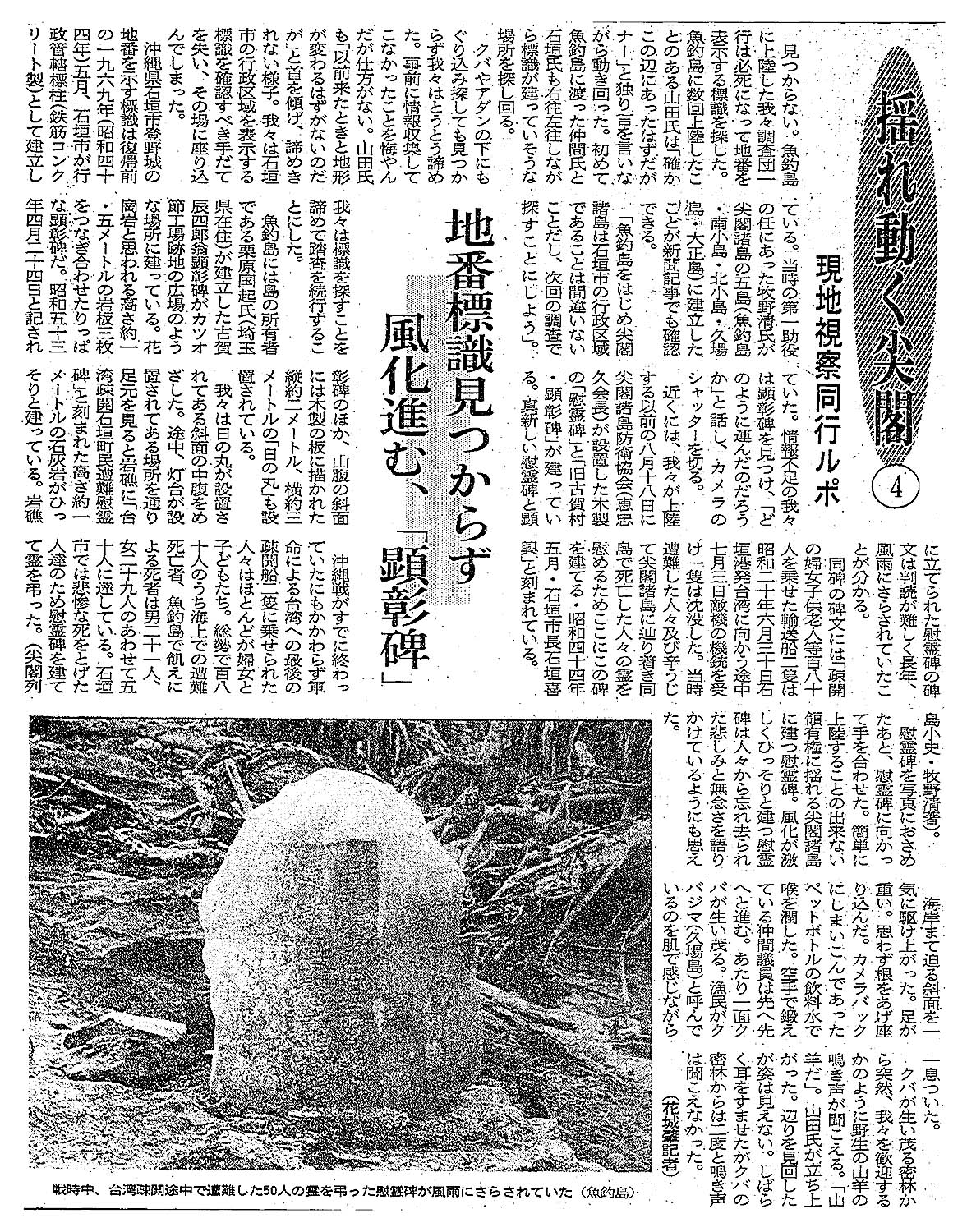 > <揺れ動く尖閣>現地視察同行ルポ④ /地番標識見つからず/風化進む、「顕彰碑」: