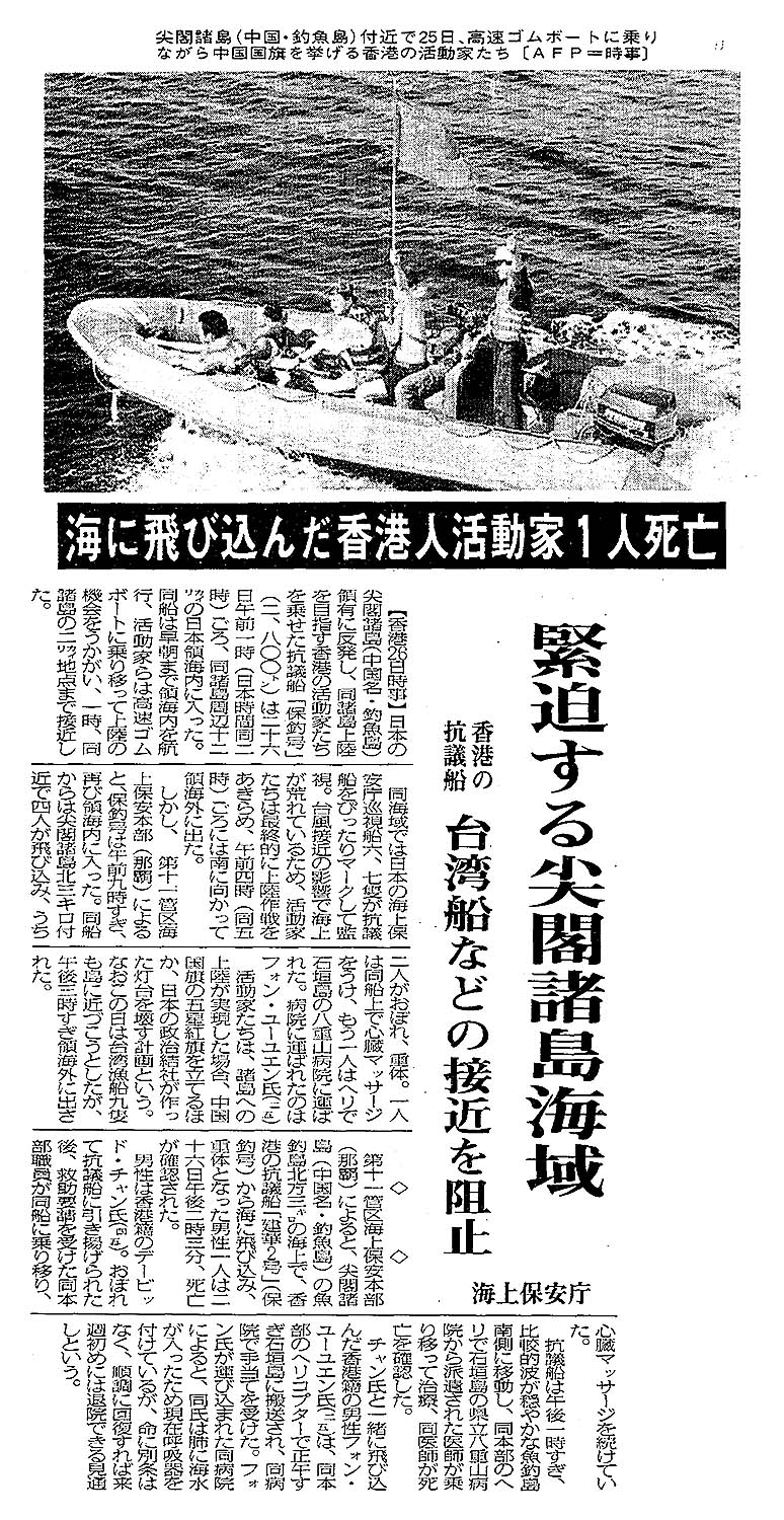 Home > 平成 > 緊迫する尖閣諸島海域/香港の抗議船 台湾船などの接近を阻止/海上保安庁/海に飛び込んだ香港人活動家1人死亡:現代仮名遣いテキスト