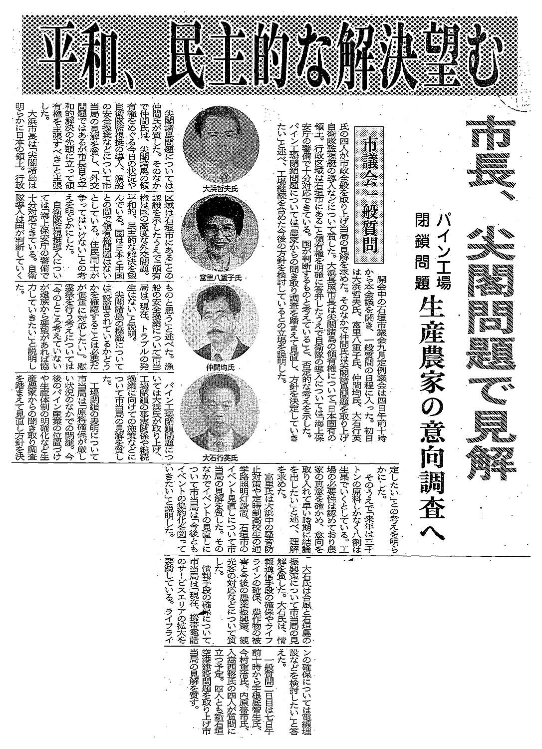 > 平和、民主的な解決望む/市長、尖閣問題で見解/パイン工場閉鎖問題 生産農家の意向調査へ:
