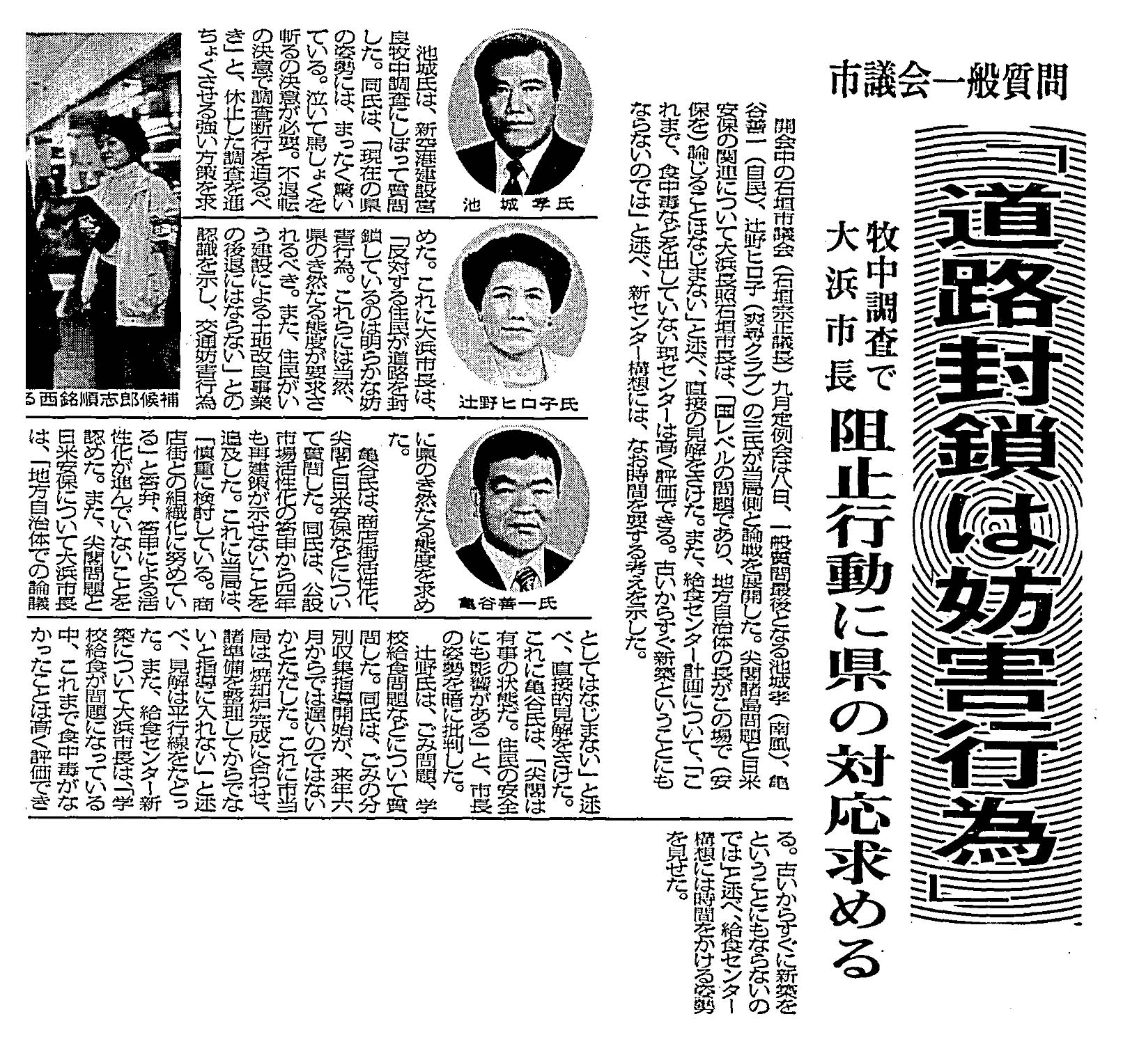 > 市議会一般質問/道路封鎖は妨害行為/牧中調査で大浜市長 阻止行動に県の対応求める:
