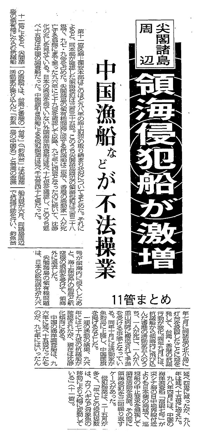 > 尖閣諸島周辺 領海侵犯船が激増/中国漁船などが不法操業/11管まとめ: