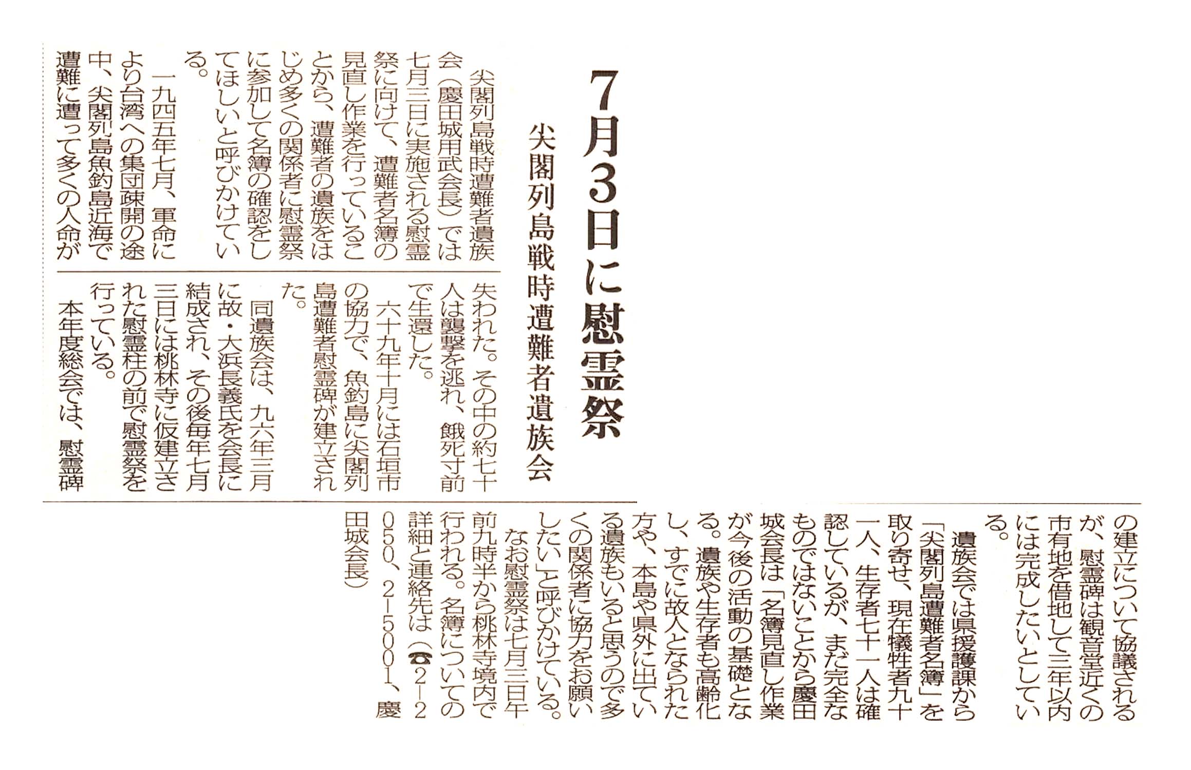 > 7月3日に慰霊祭/尖閣列島戦時遭難者遺族会: