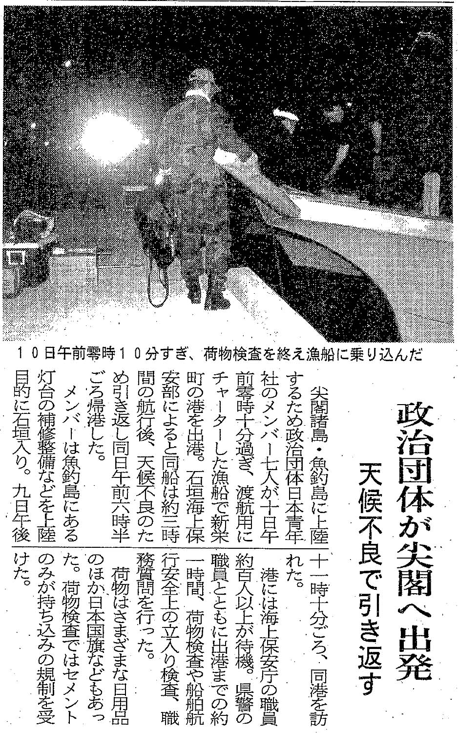 > 政治団体が尖閣へ出発/天候不良で引き返す: