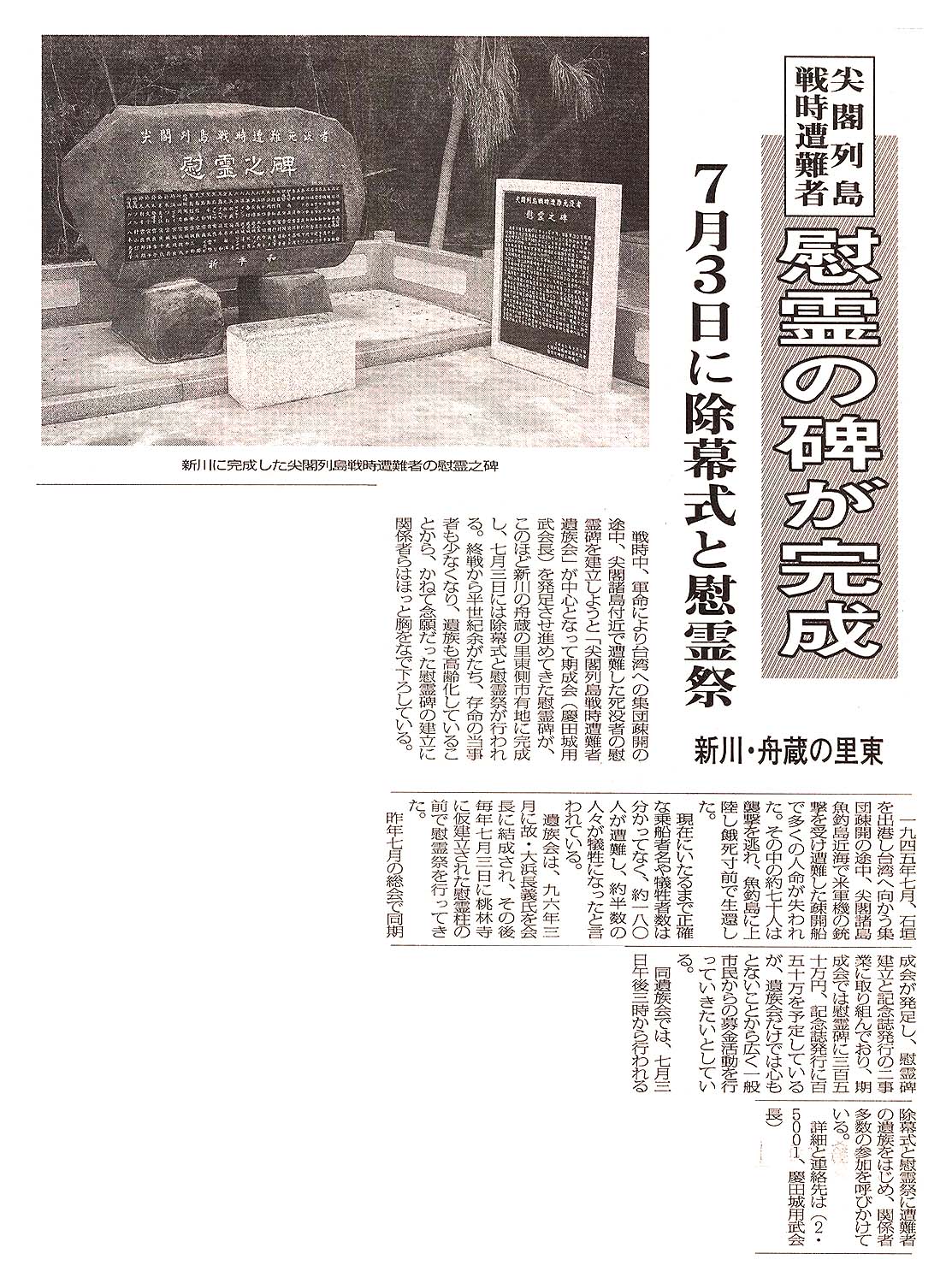 尖閣列島戦時遭難者/慰霊の碑が完成/7月3日に除幕式と慰霊祭/新川・舟蔵の里東