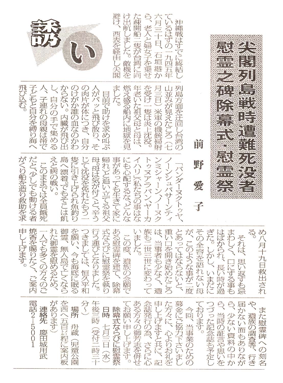 > <誘い>尖閣列島戦時遭難死没者慰霊之碑除幕式・慰霊祭: