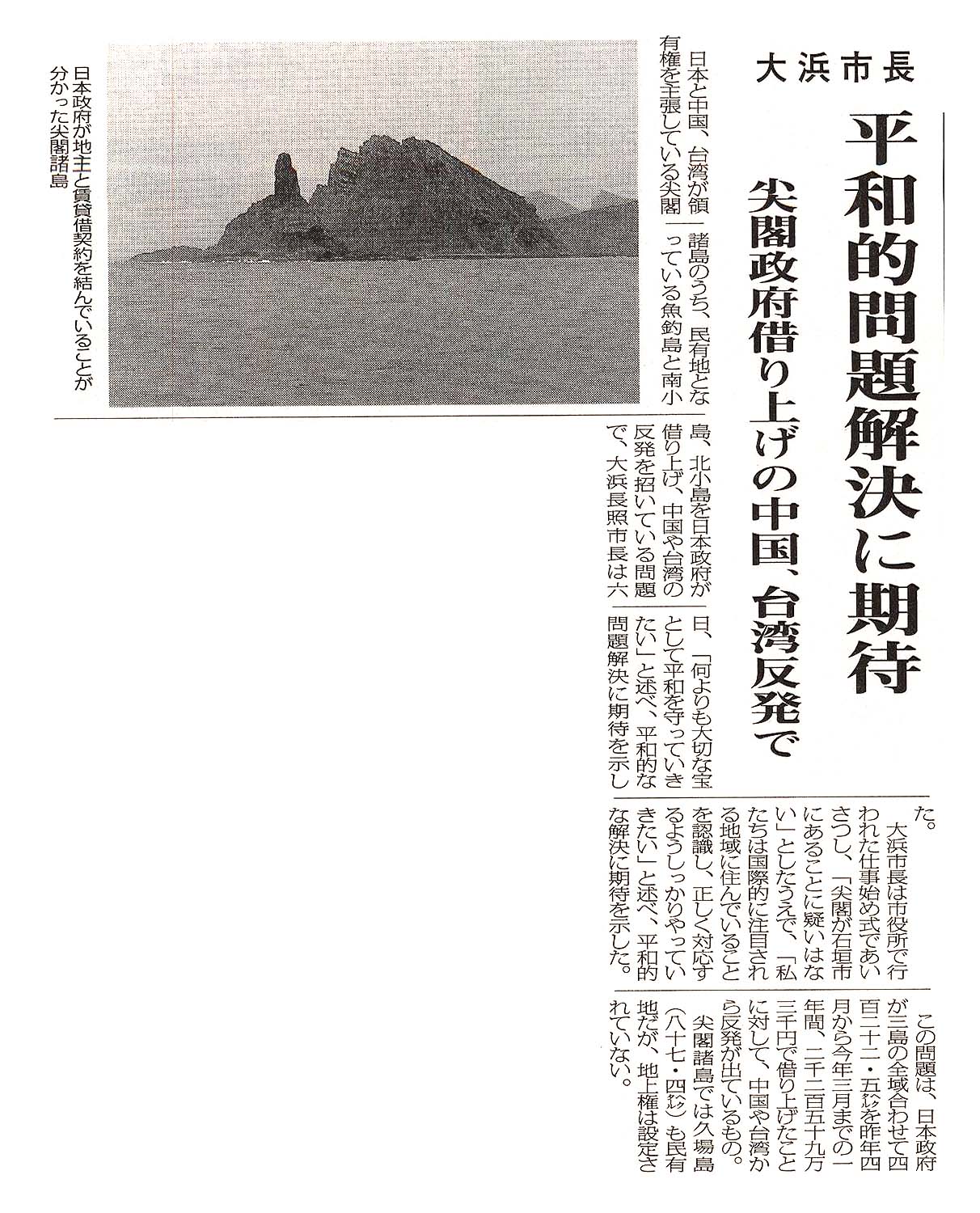 > 大浜市長 平和的問題解決に期待/尖閣政府借り上げの中国、台湾反発で: