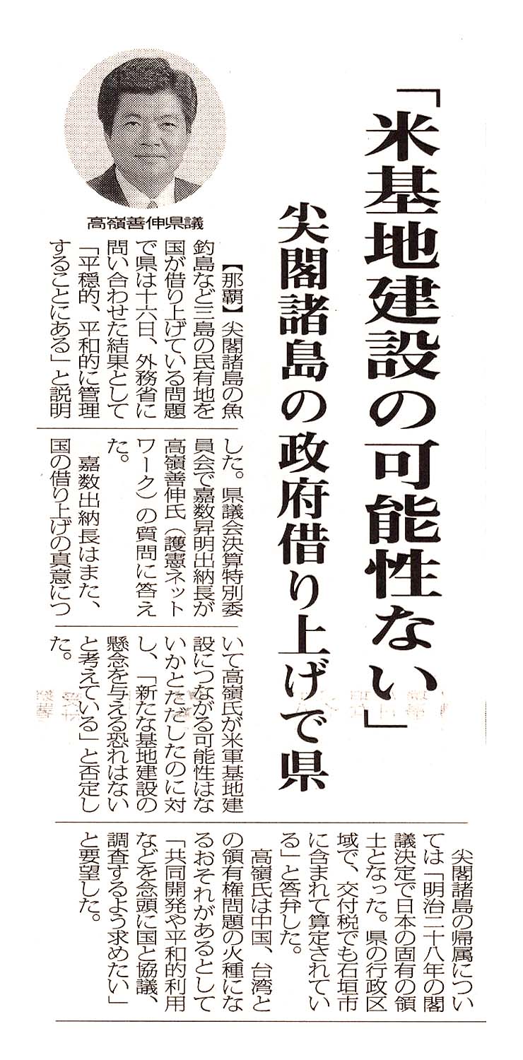 「米基地建設の可能性ない」/尖閣諸島の政府借り上げで県