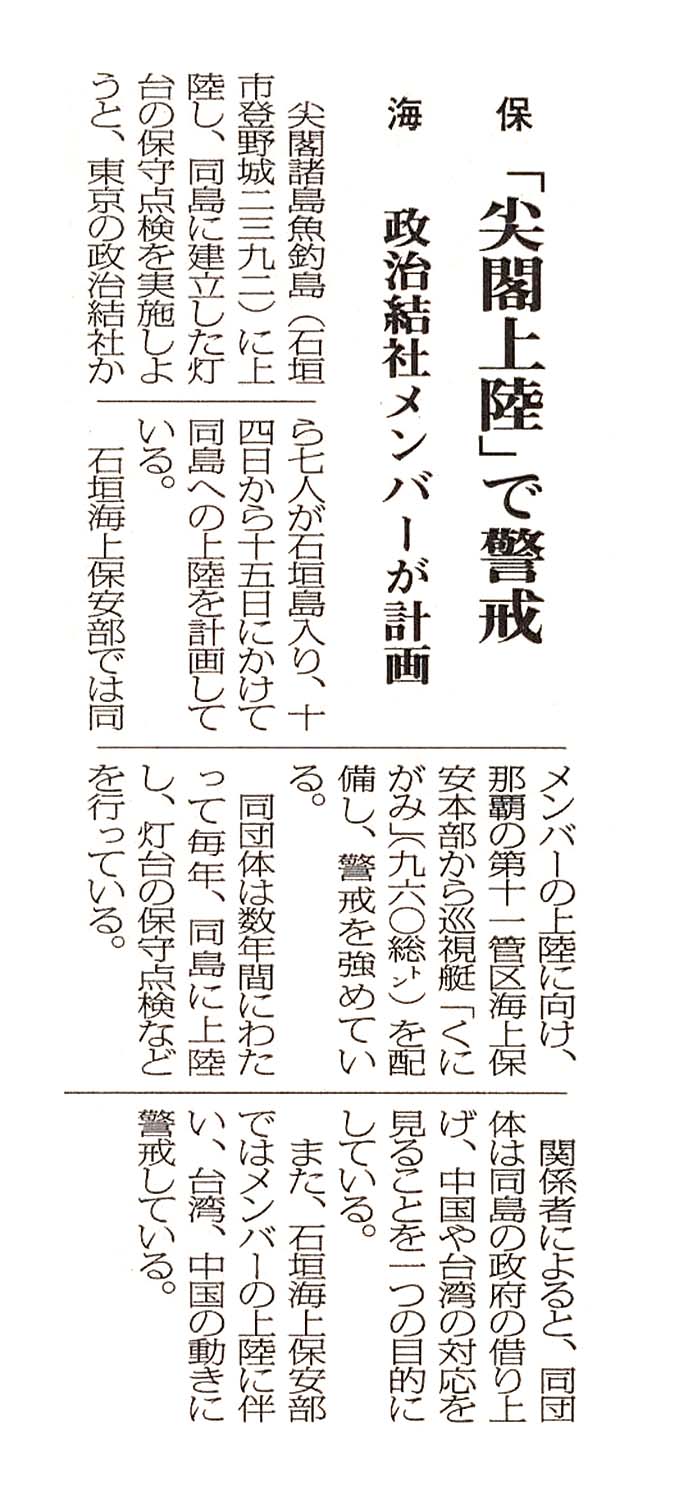 > 海保/「尖閣上陸」で石垣海上保安部が警戒/ 政治結社メンバーが計画: