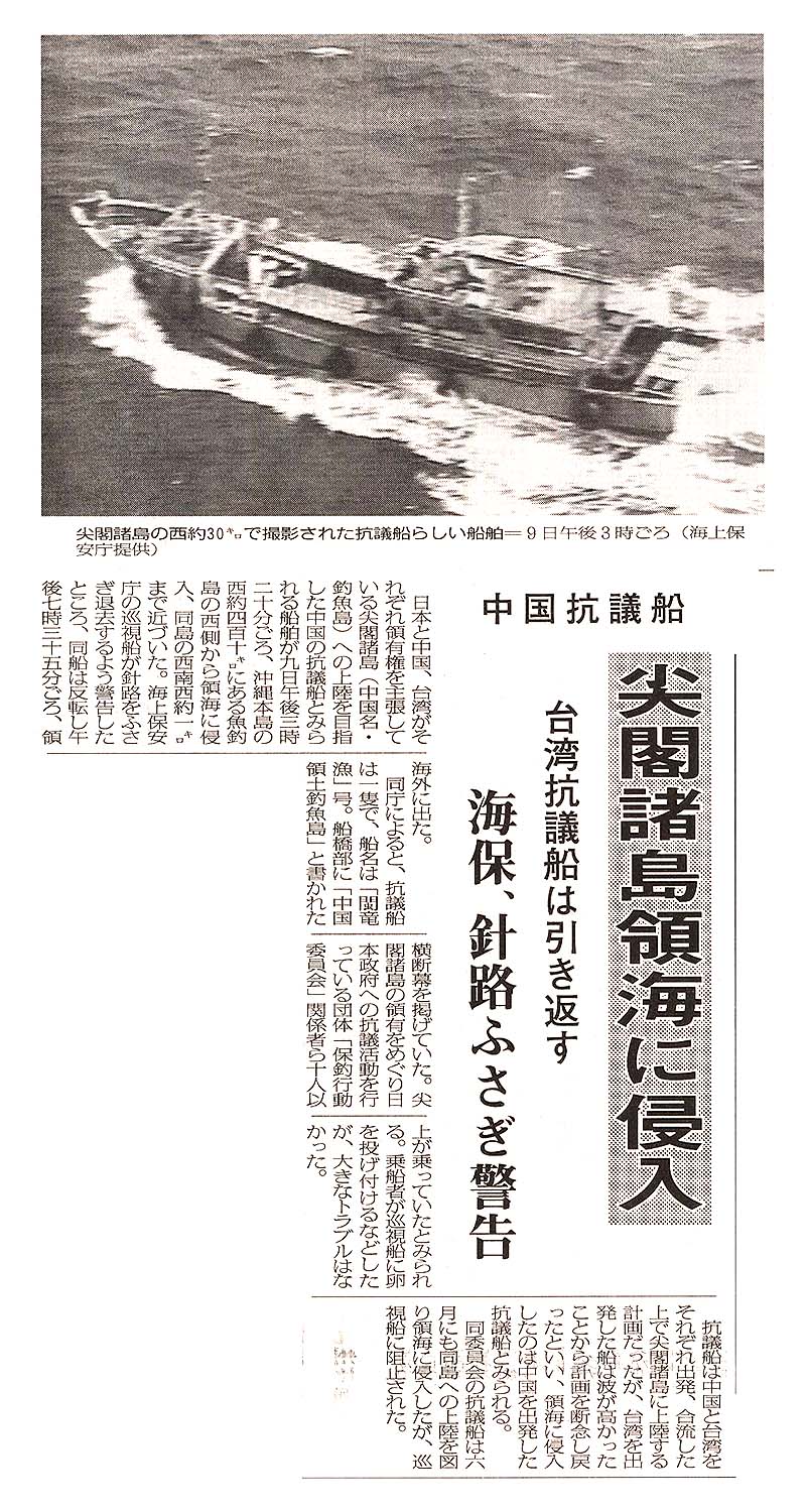 > 中国抗議船/尖閣諸島領海に侵入/台湾抗議船は引き返す/海保、針路ふさぎ警告: