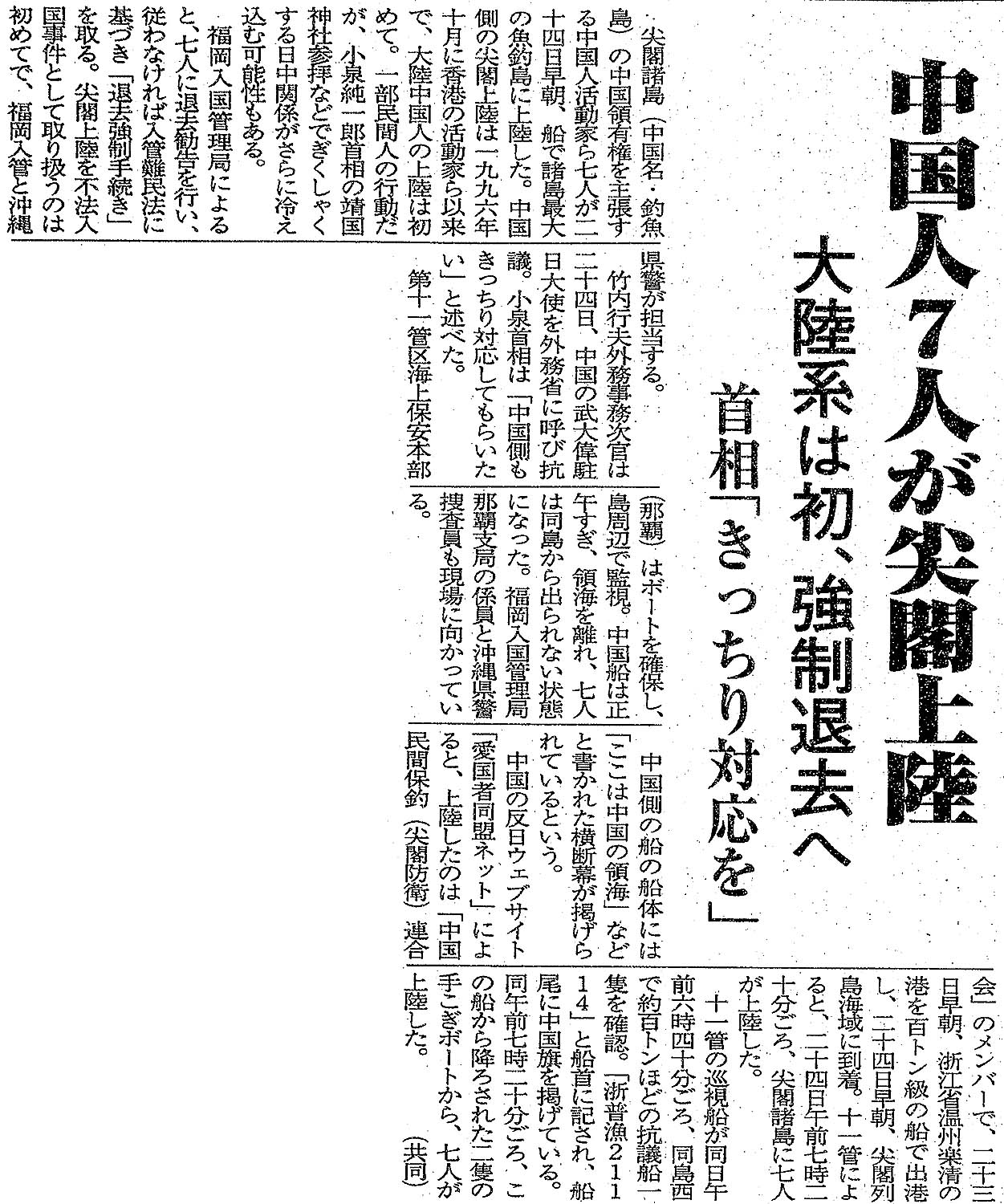 > 中国人7人が尖閣上陸/大陸系は初、強制退去へ/首相「きっちり対応を」:
