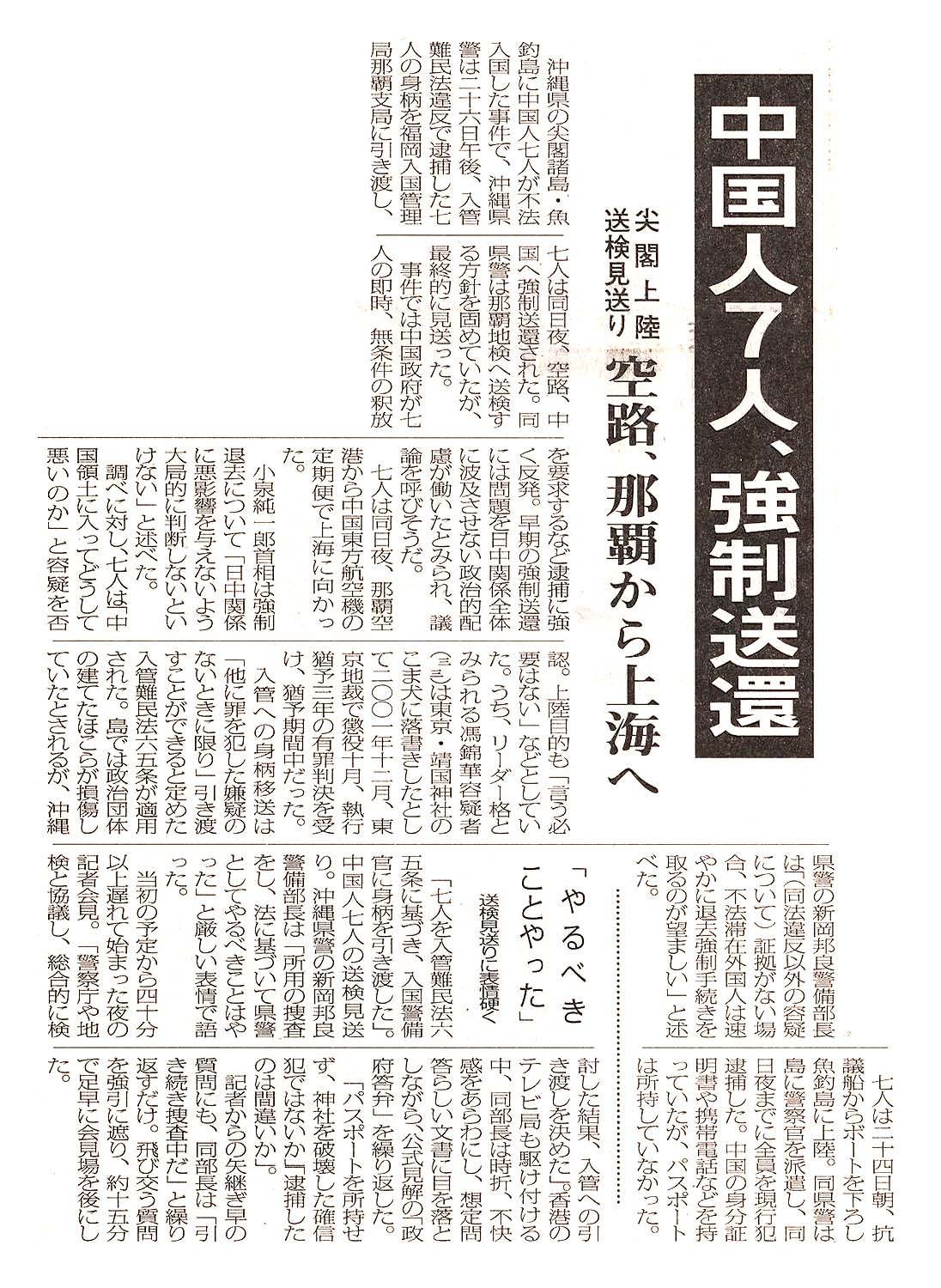 > 中国人7人、強制送還/尖閣上陸送検見送り/空路、那覇から上海へ: