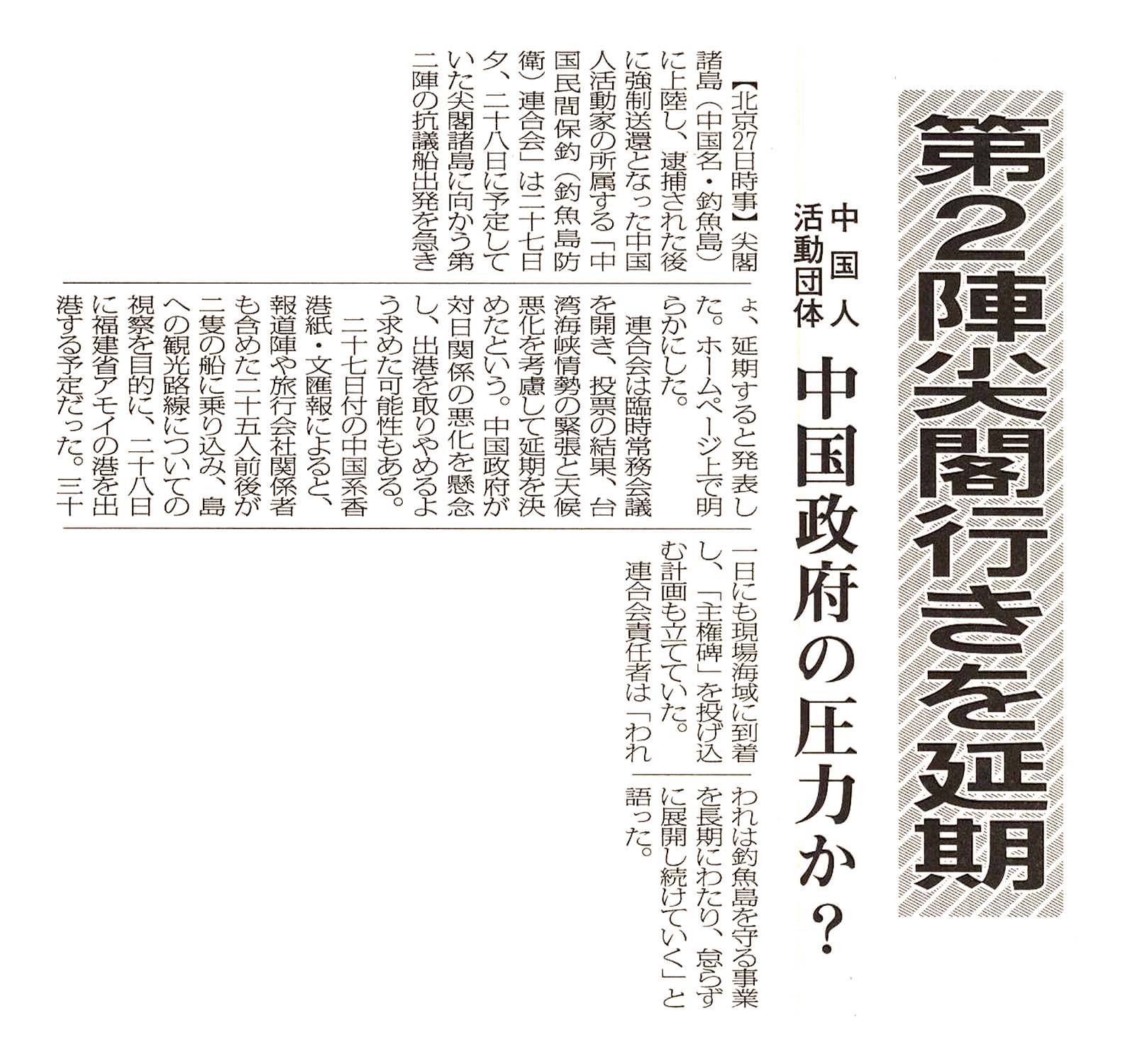 > 第2陣尖閣行きを延期/中国人活動団体 中国政府の圧力か?: