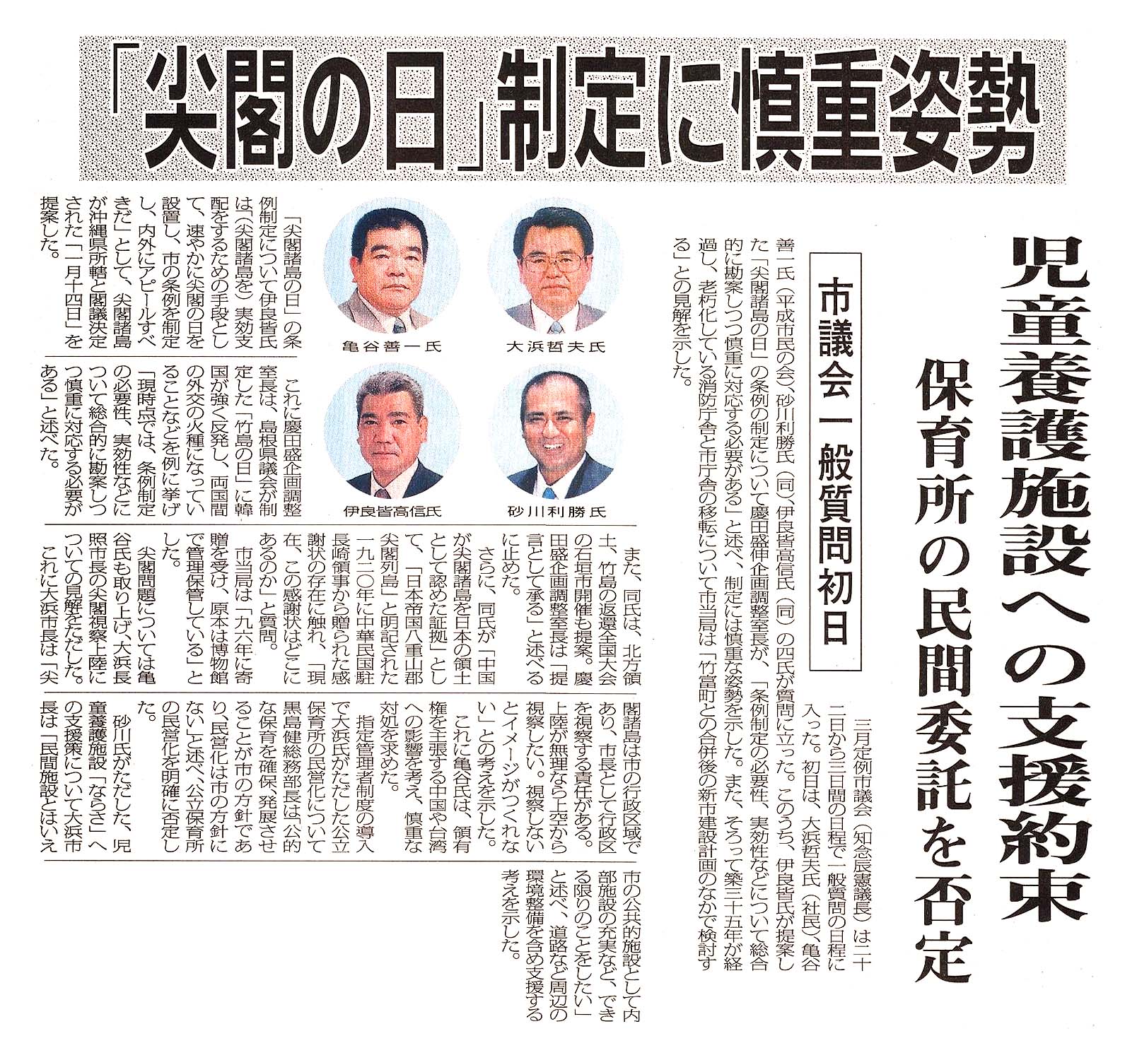 「尖閣の日」制定に慎重姿勢/児童養護施設への支援約束/保育所の民間委託を否定/市議会一般質問初日 現代仮名遣いテキスト