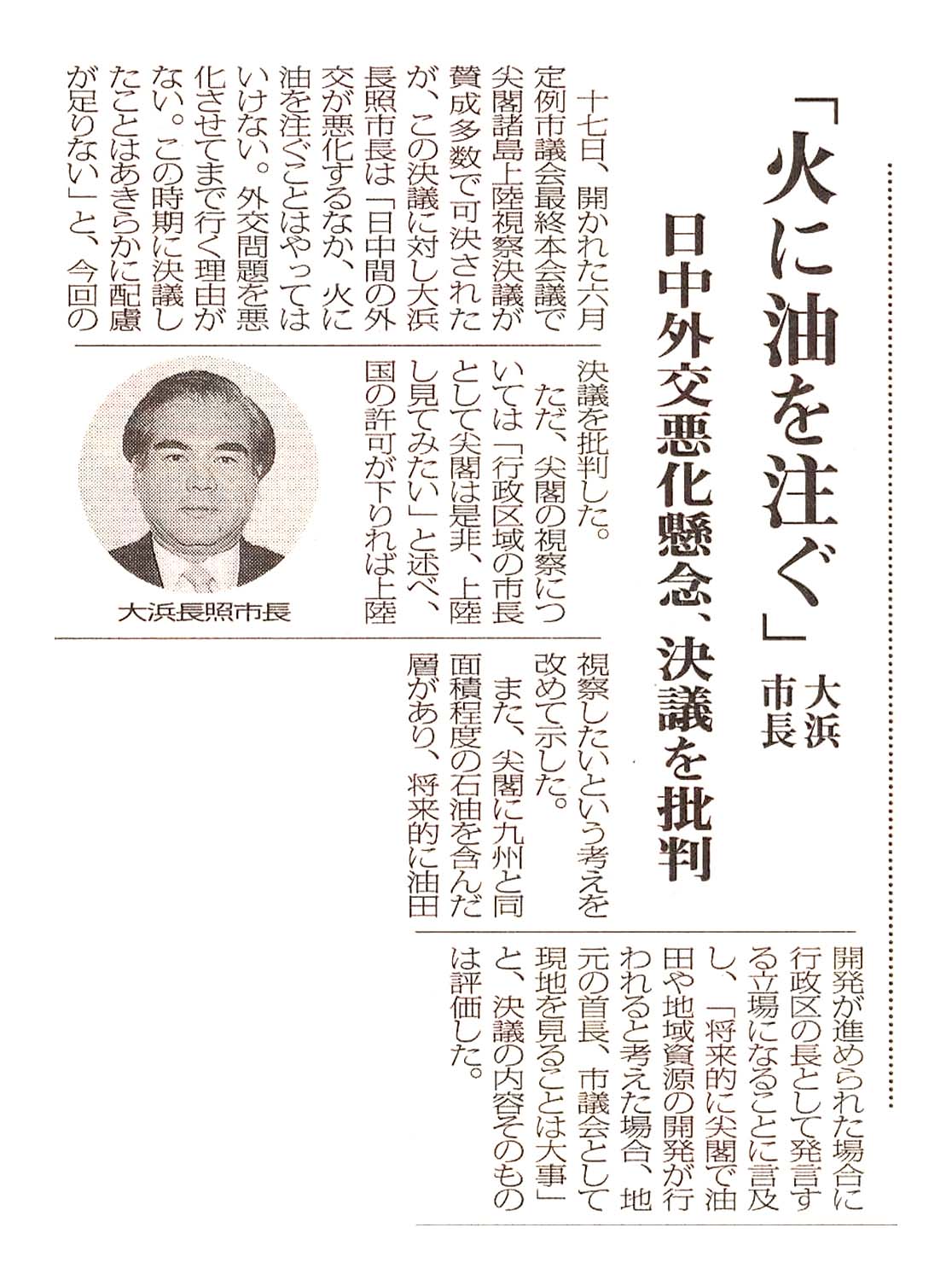 > 「火に油を注ぐ」大浜市長/日中外交悪化懸念、決議を批判: