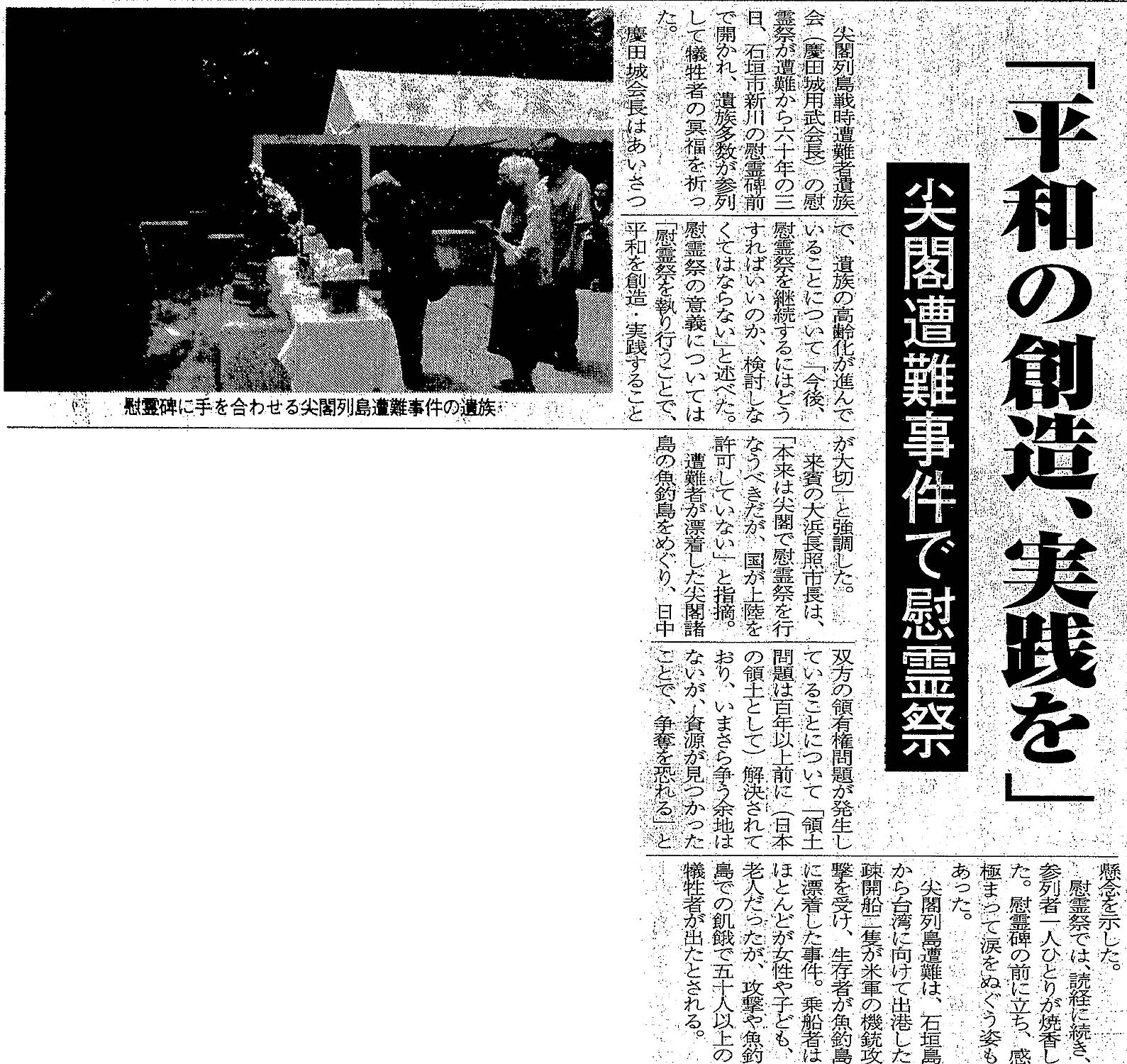 > 「平和の創造、実践を」/尖閣遭難事件で慰霊祭: