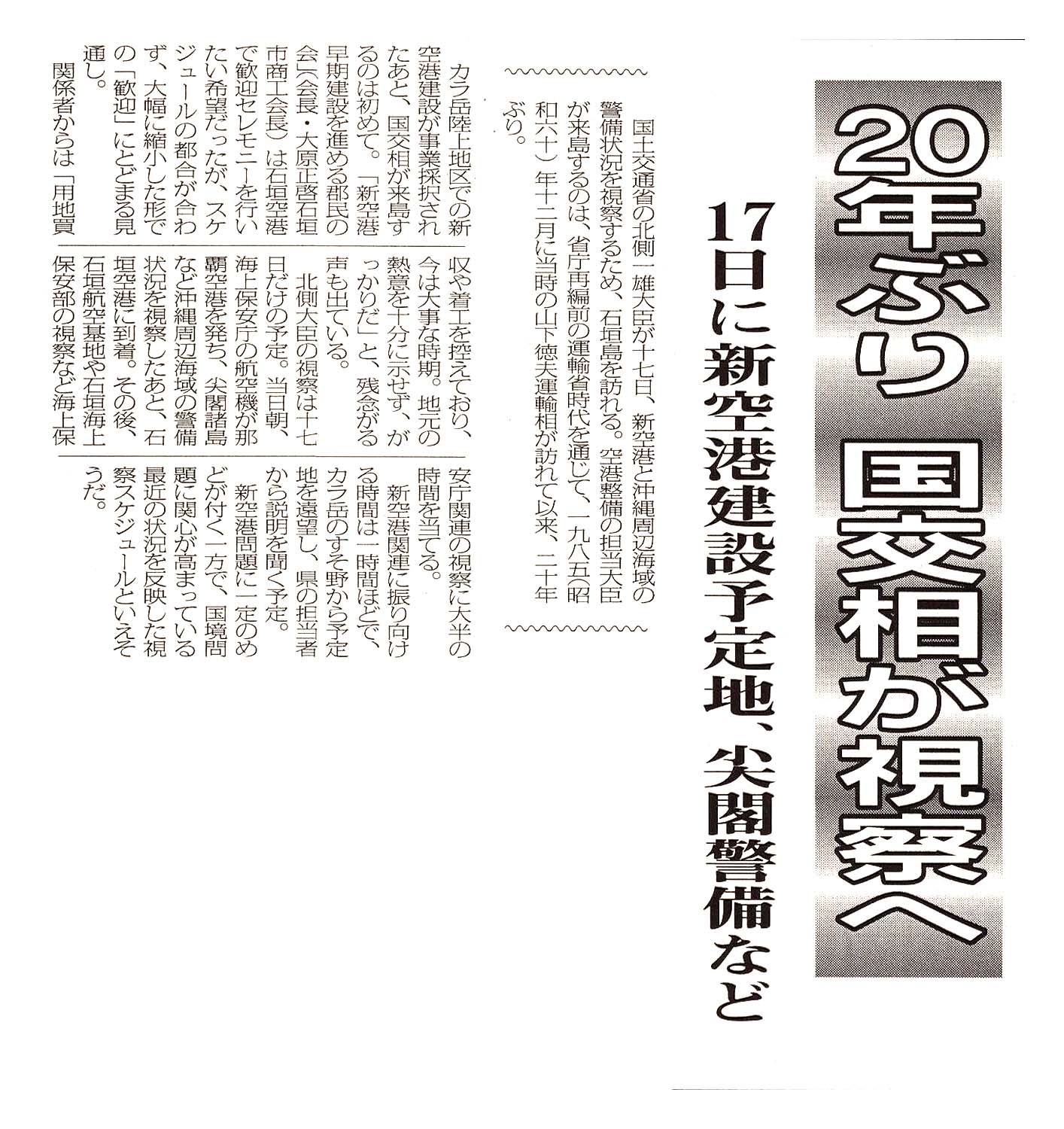 > 20年ぶり 国交相が視察へ/17日に新空港建設予定地、尖閣警備など: