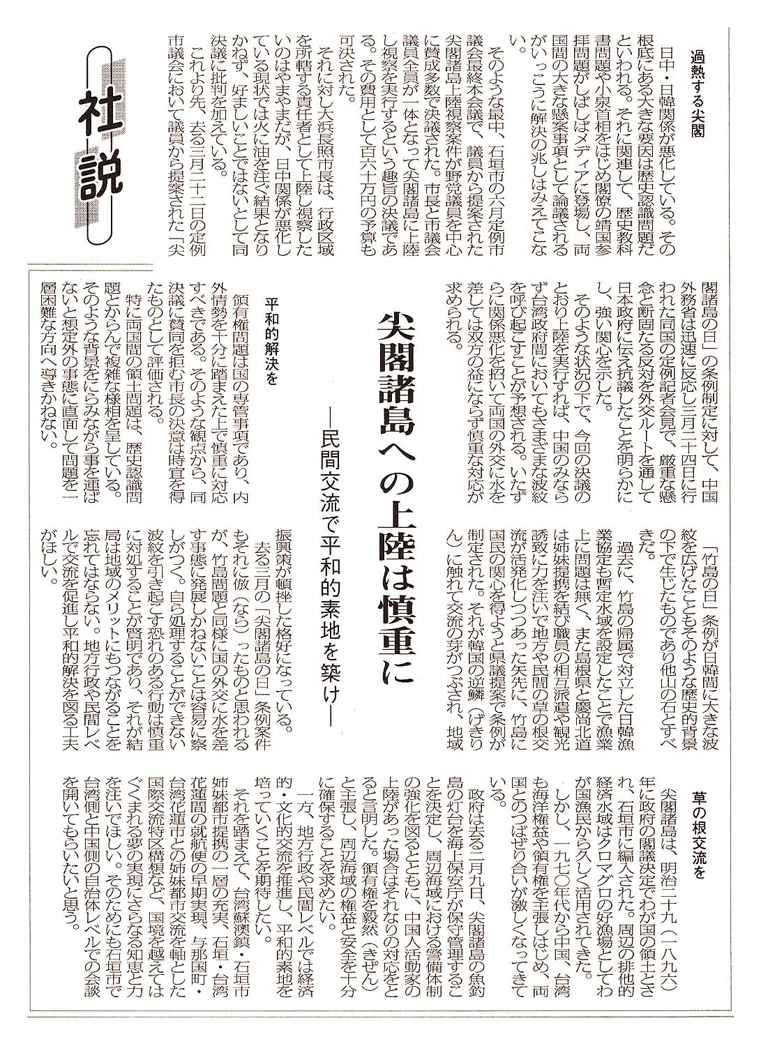 > <社説>尖閣諸島への上陸は慎重に -民間交流で平和的素地を築けー: