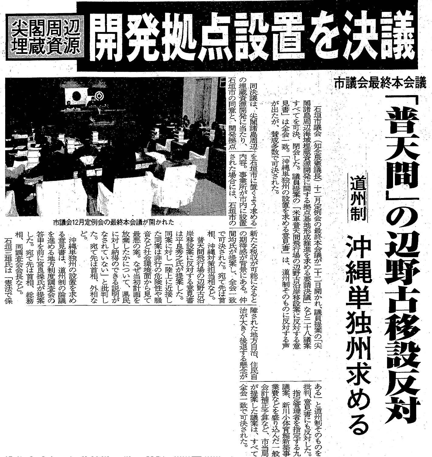 尖閣周辺埋蔵資源 開発拠点設置を決議/市議会最終本会議/「普天間」の辺野古移設反対/道州制 沖縄単独州求める