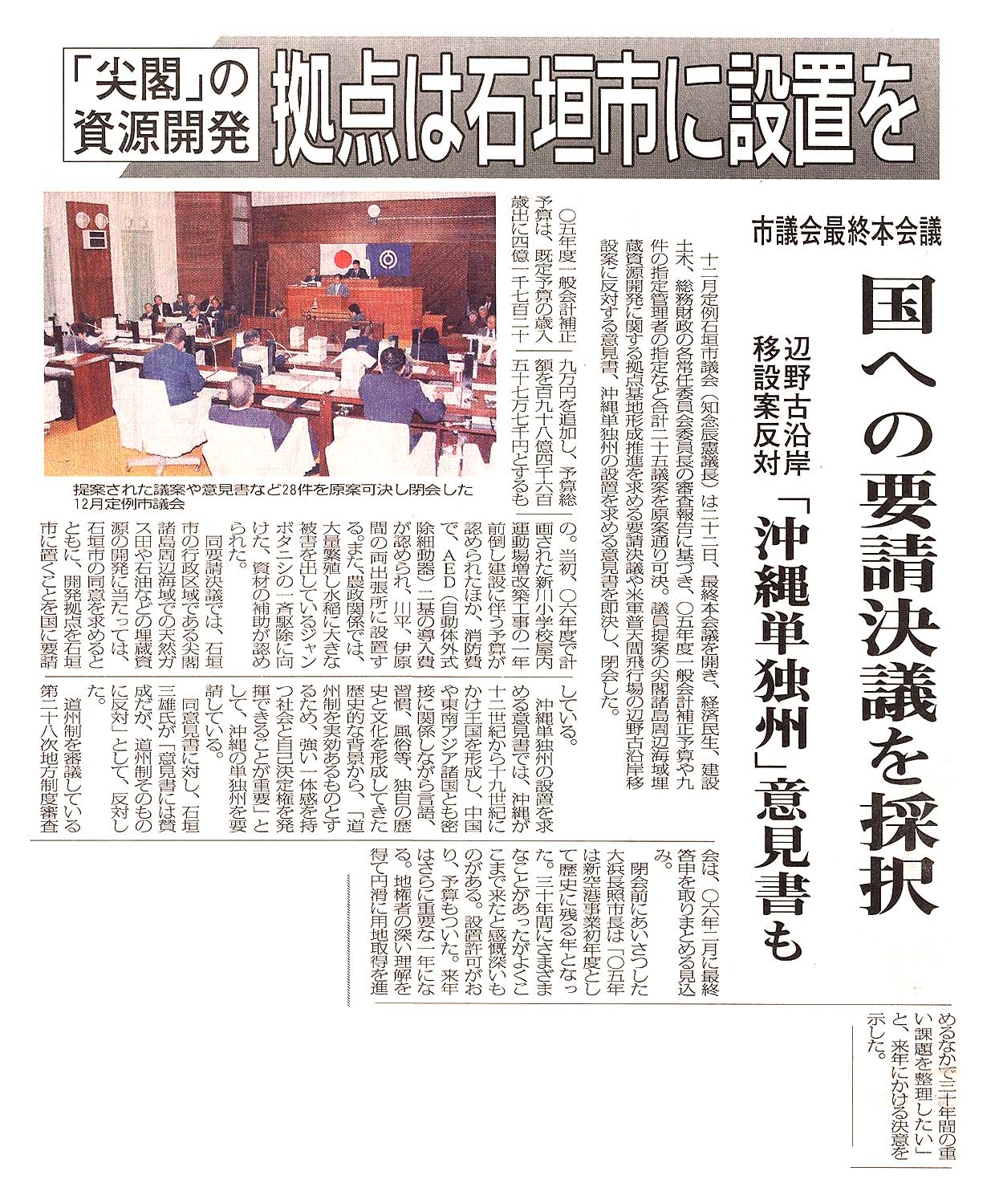 Home > 平成 > 「尖閣」の資源開発/拠点は石垣市に設置を/市議会最終本会議/国への要請決議を採択/辺野古沿岸移設案反対「沖縄単独州」意見書も:現代仮名遣いテキスト