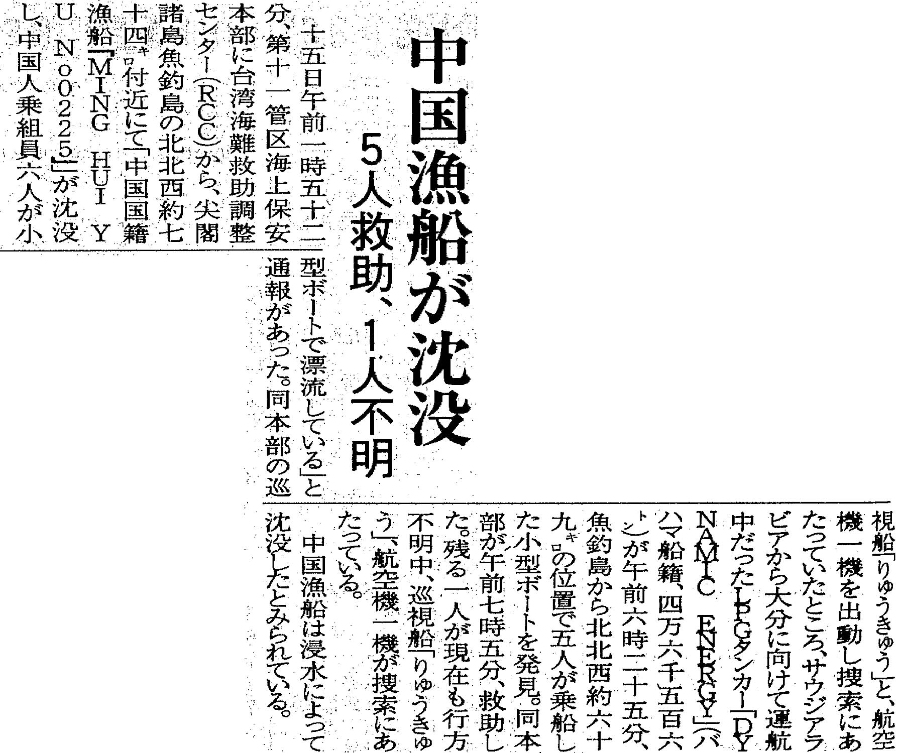 > 中国漁船が沈没/5人救助、1人不明: