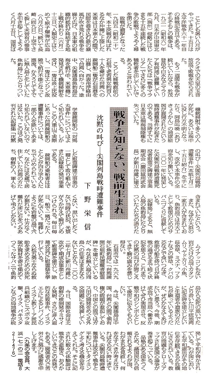 > <戦争を知らない、戦前生まれ> 沈黙の叫びー尖閣列島戦時遭難事件/下野栄信: