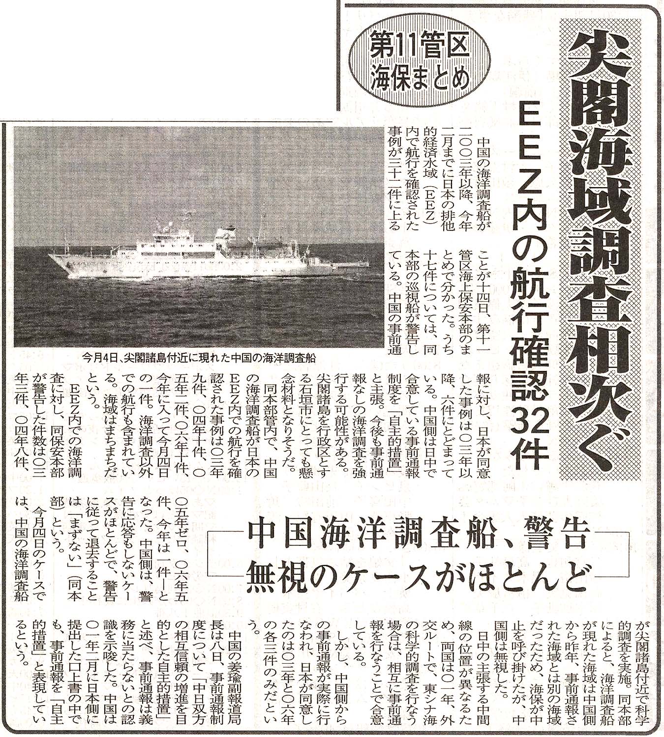 > 第11管区海保まとめ/尖閣海域調査相次ぐ/EEZ内の航行確認32件: