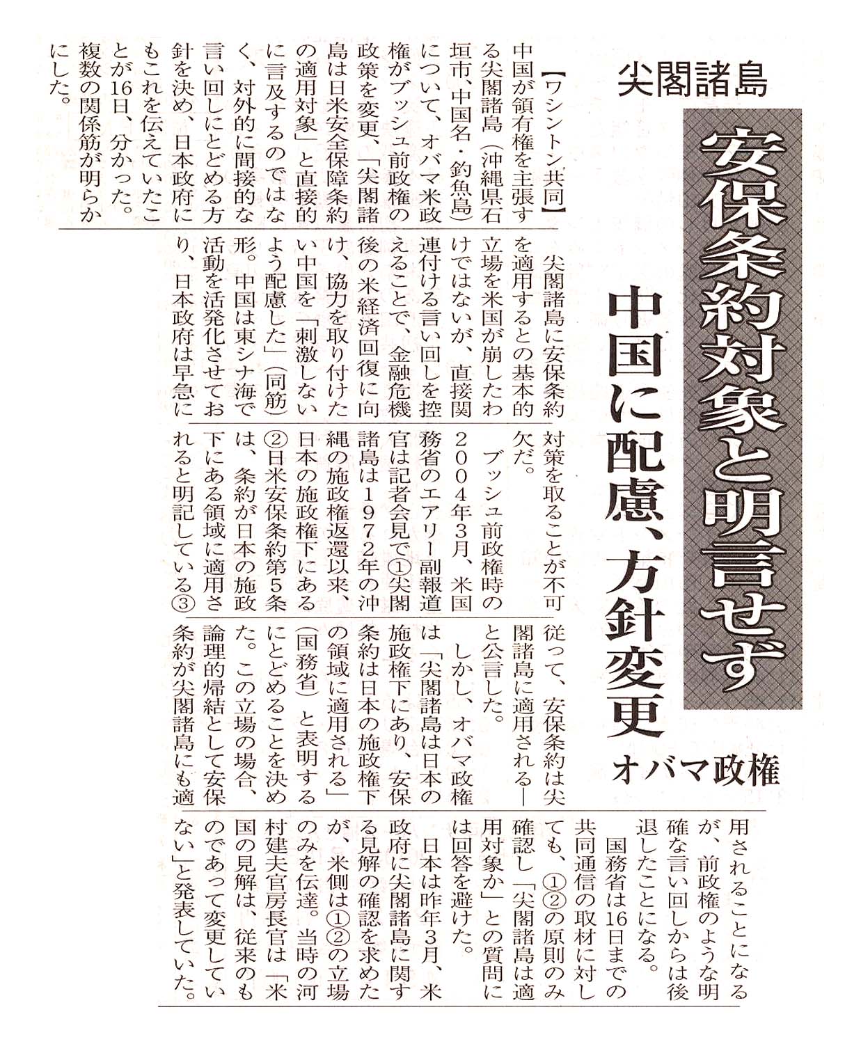> 尖閣諸島/安保条約対象と明言せず/中国に配慮、方針変更 オバマ政権: