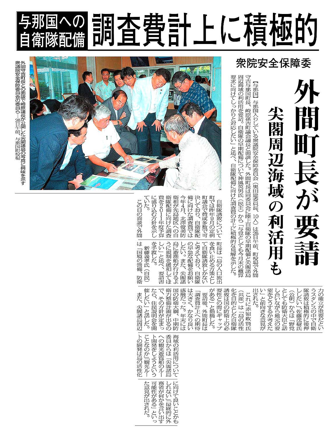 与那国への自衛隊配備/調査費計上に積極的/衆院安全保障委/外間町長が要請/尖閣周辺海域の利活用も