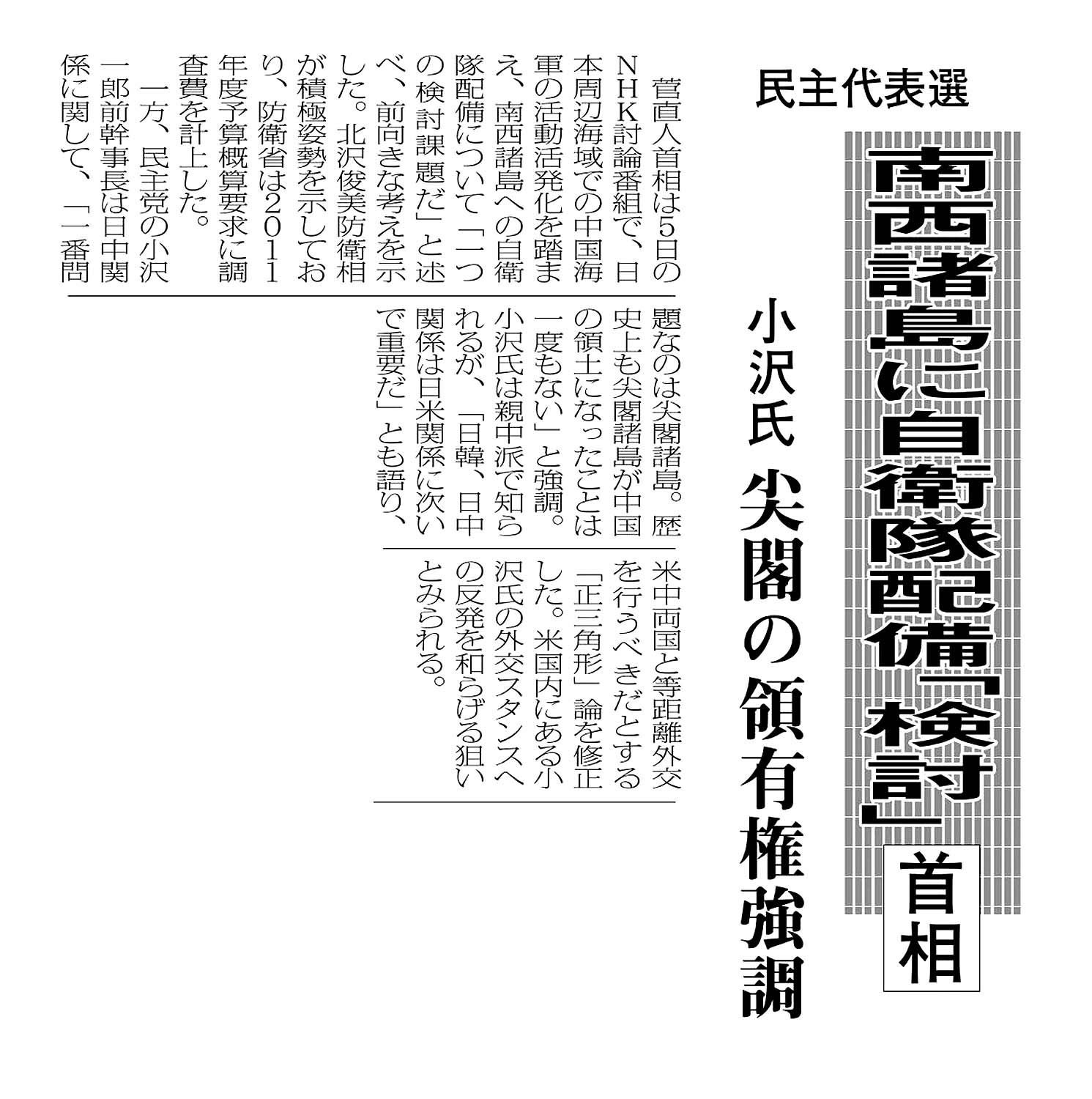 民主党代表選/南西諸島に自衛隊配備「検討」 首相/小沢氏 尖閣の領有権強調