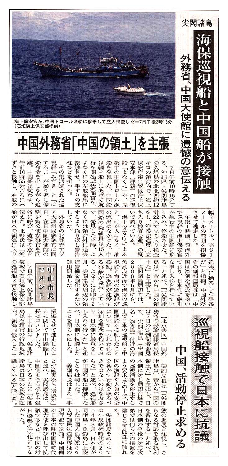 > 尖閣諸島/海保巡視船と中国船が接触/外務省、中国大使館に遺憾の意伝える: