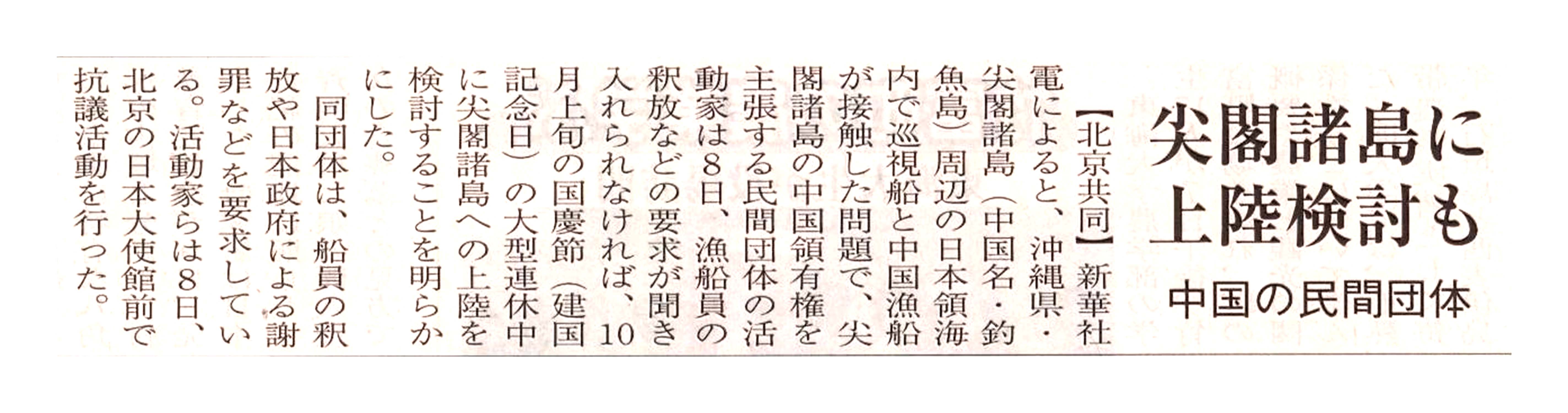 > 尖閣諸島に上陸検討も/中国の民間団体 :