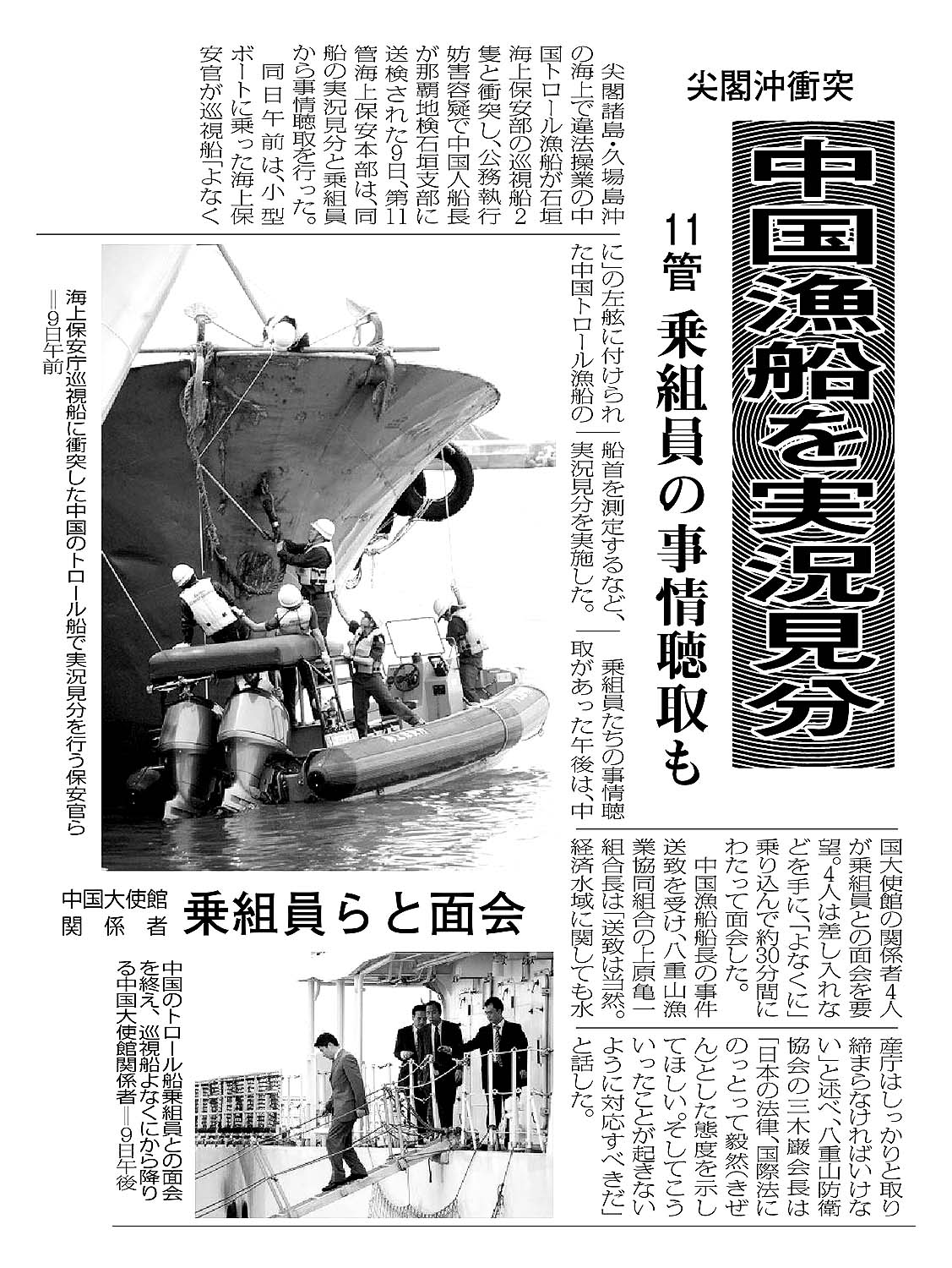 > 尖閣沖衝突/中国漁船を実況見分/11管 乗組員の事情聴取も/中国大使館関係者 乗組員らと面会: