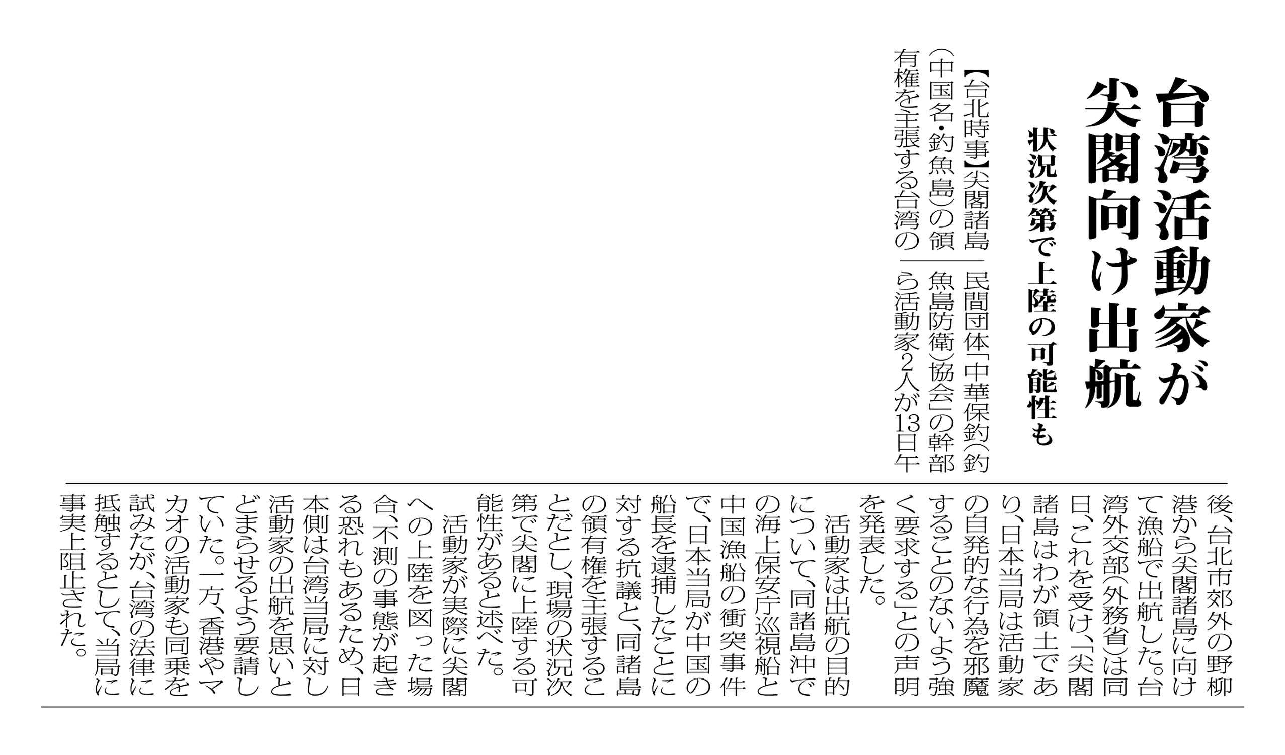 > 台湾活動家が尖閣向け出航/状況次第で上陸の可能性も:
