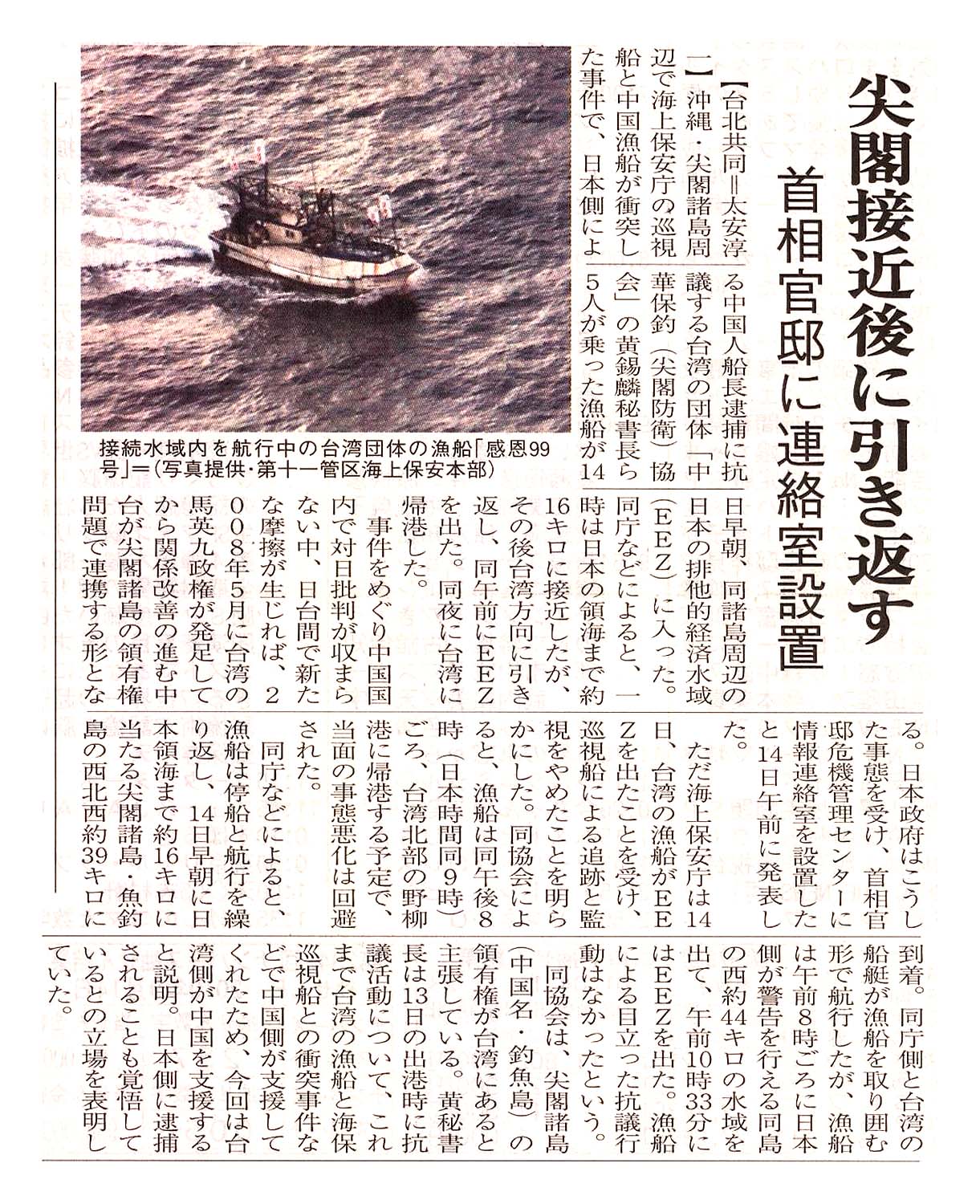 > 尖閣接近後に引き返す/首相官邸に連絡室設置: