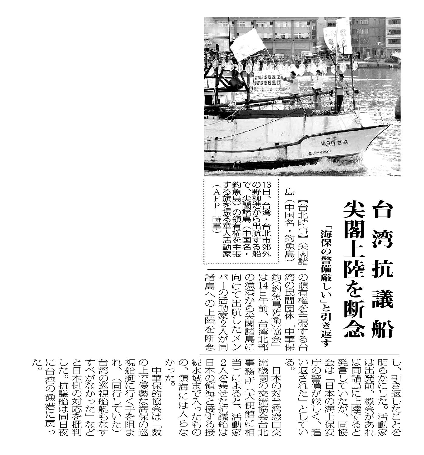 > 台湾抗議船 尖閣上陸を断念/「海保の警備厳しい」と引き返す: