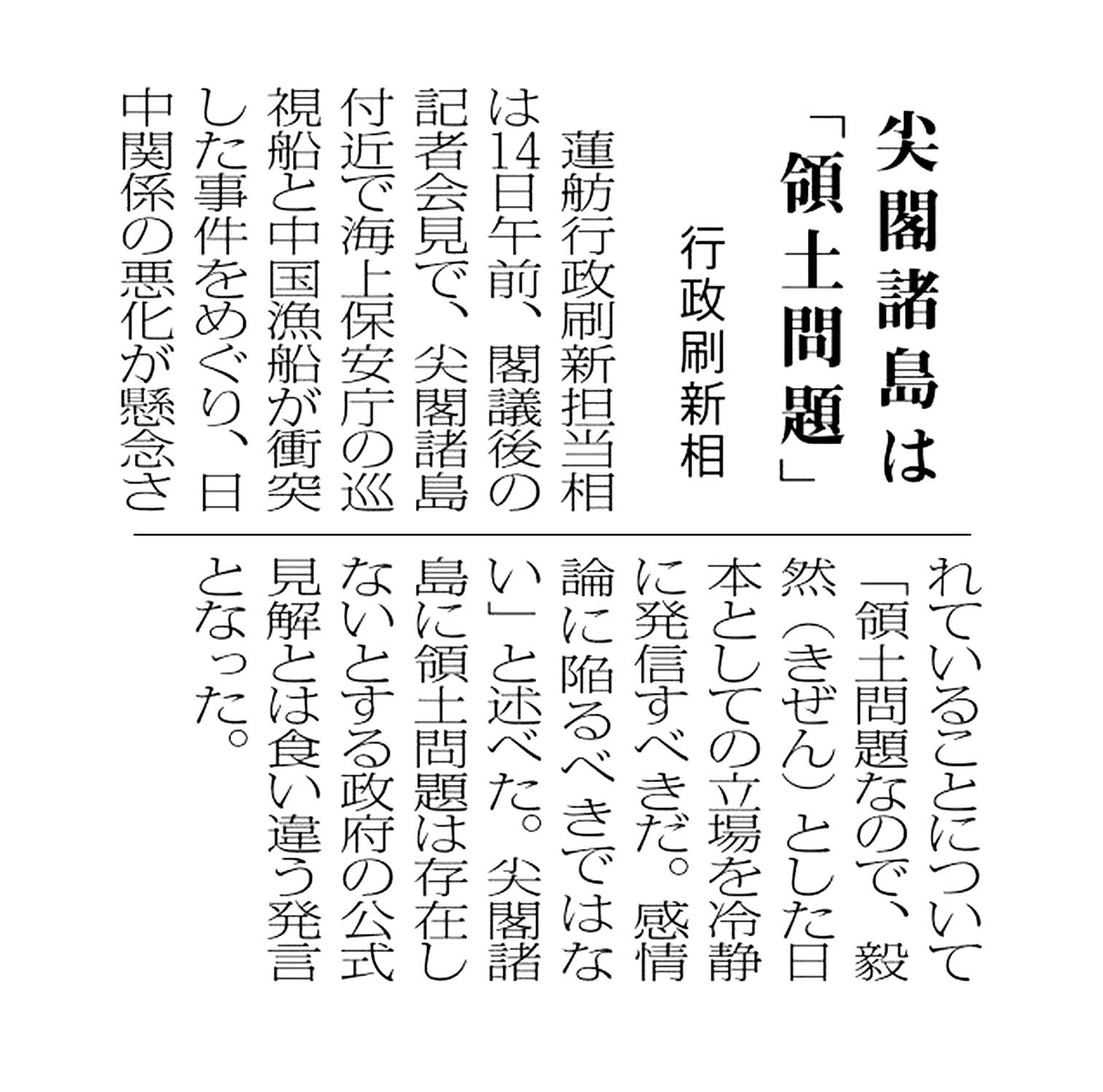 > 尖閣諸島は「領土問題」/行政刷新相: