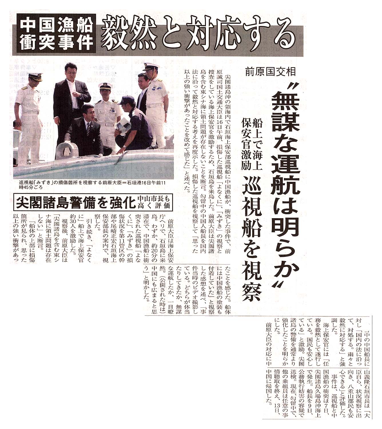 中国漁船衝突事件 毅然と対応する/前原国交相 ”無謀な運航は明らか”/船上で海上保安官激励 巡視船を視察 /尖閣諸島警備を強化/中山市長も高く評価
