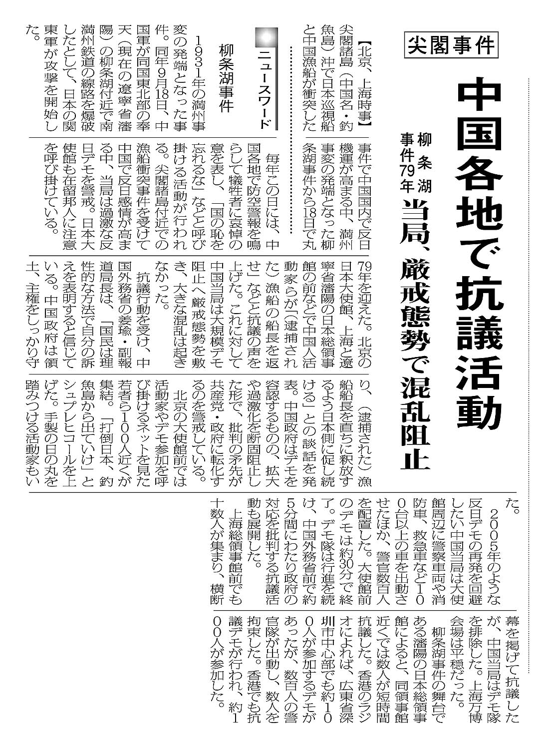 > 尖閣事件/中国各地で抗議活動/柳条湖事件79年/当局、厳戒態勢で混乱阻止 :