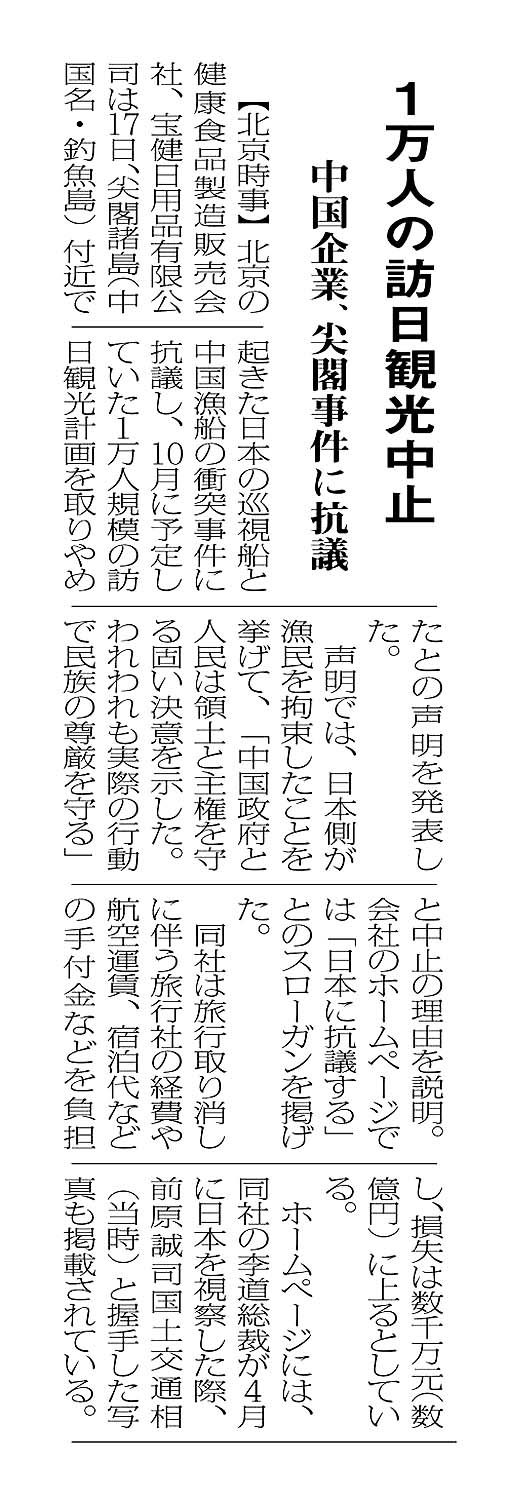 > 1万人の訪日観光中止/中国企業、尖閣事件に抗議:
