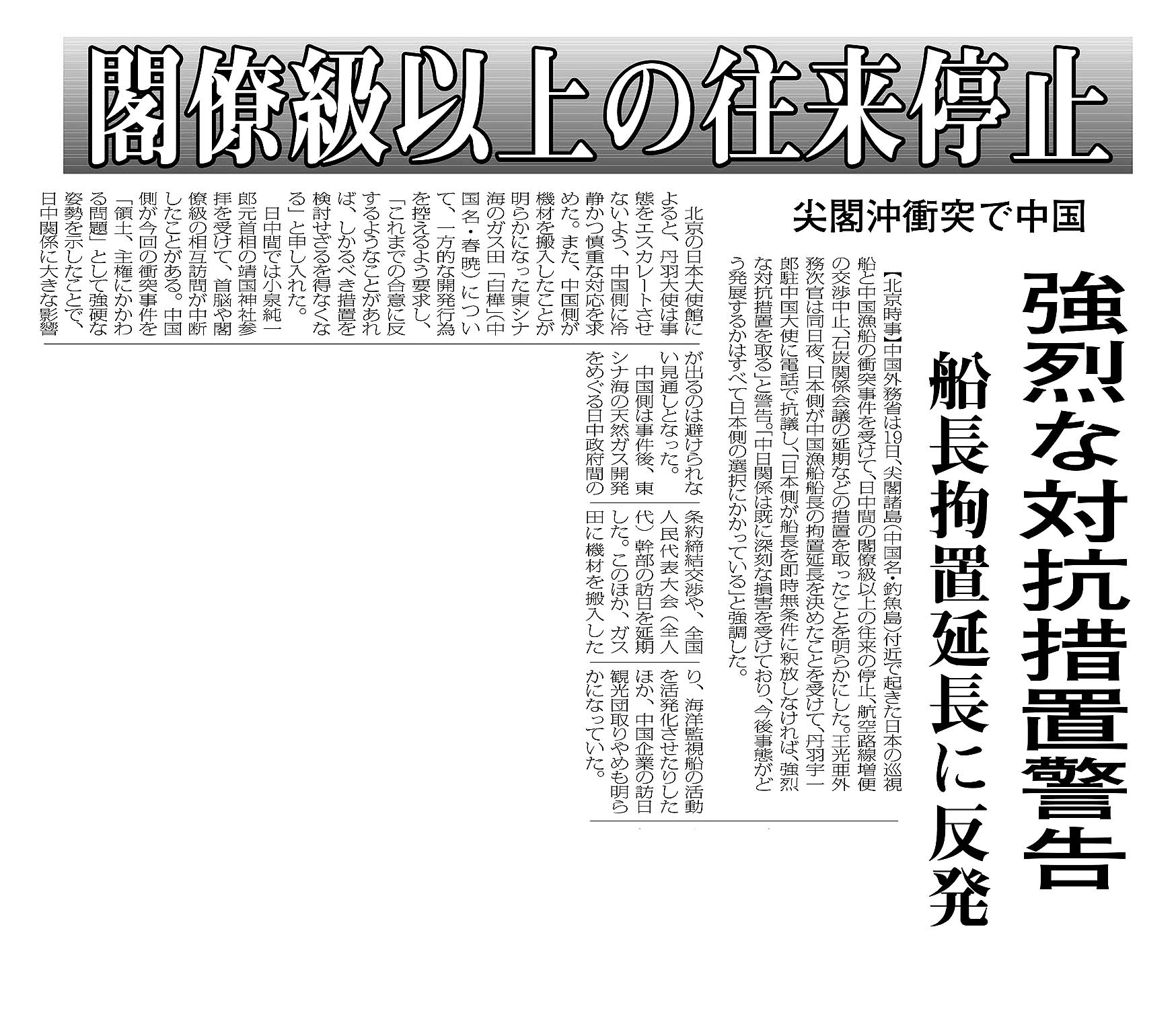 > 閣僚級以上の往来停止/尖閣沖衝突で中国/強烈な対抗措置警告 船長拘置延長に反発:
