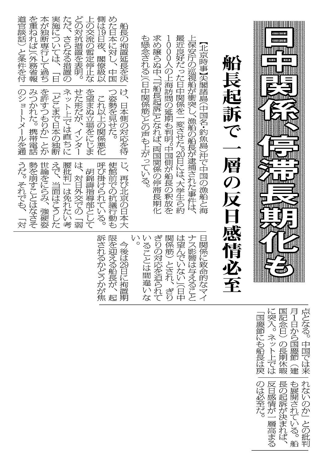 > 日中関係、停滞長期化も/船長起訴で一層の反日感情必至: