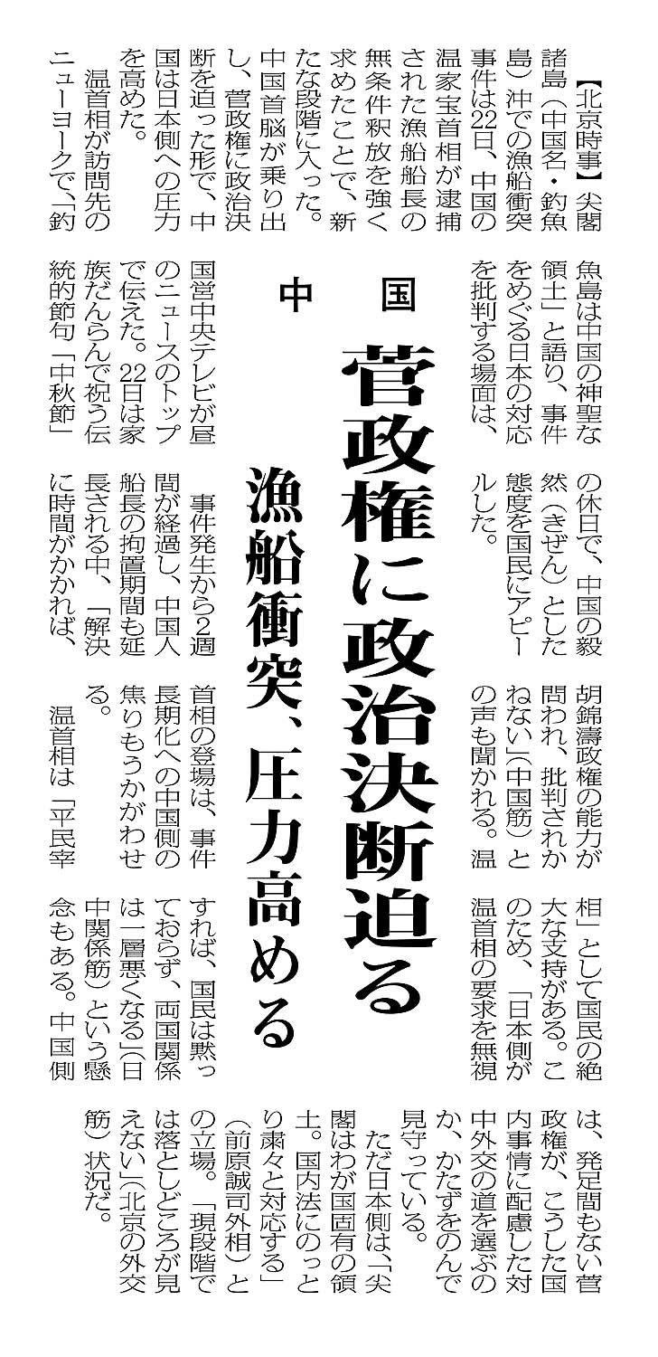 > 中国/菅政権に政治決断迫る/漁船衝突、圧力高める: