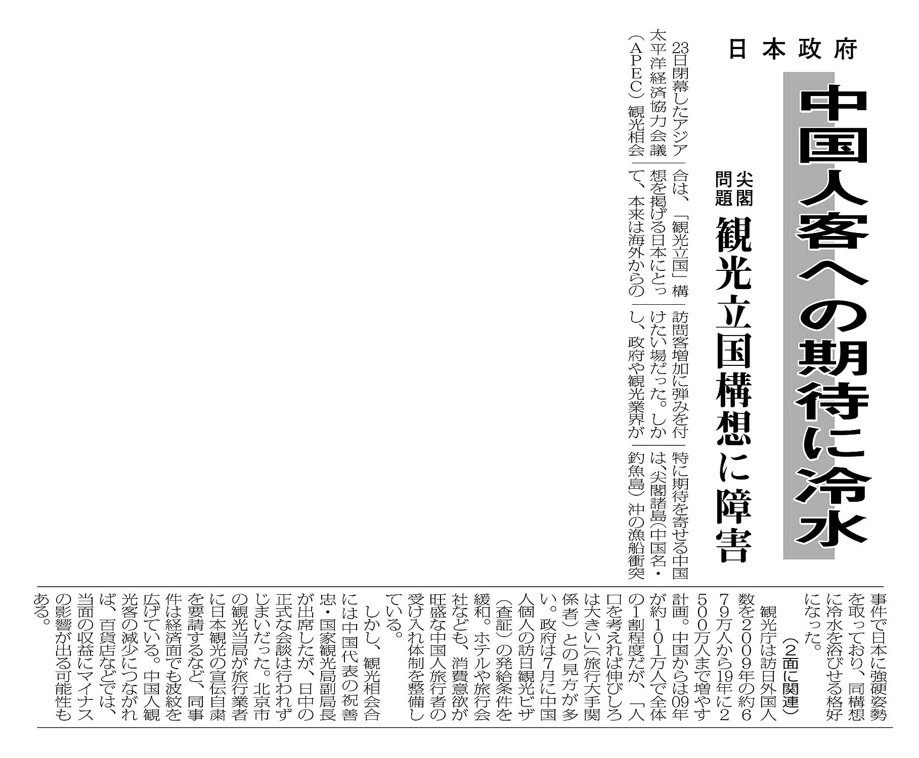> 日本政府/中国人客への期待に冷水/尖閣諸島 観光立国構想に障害:
