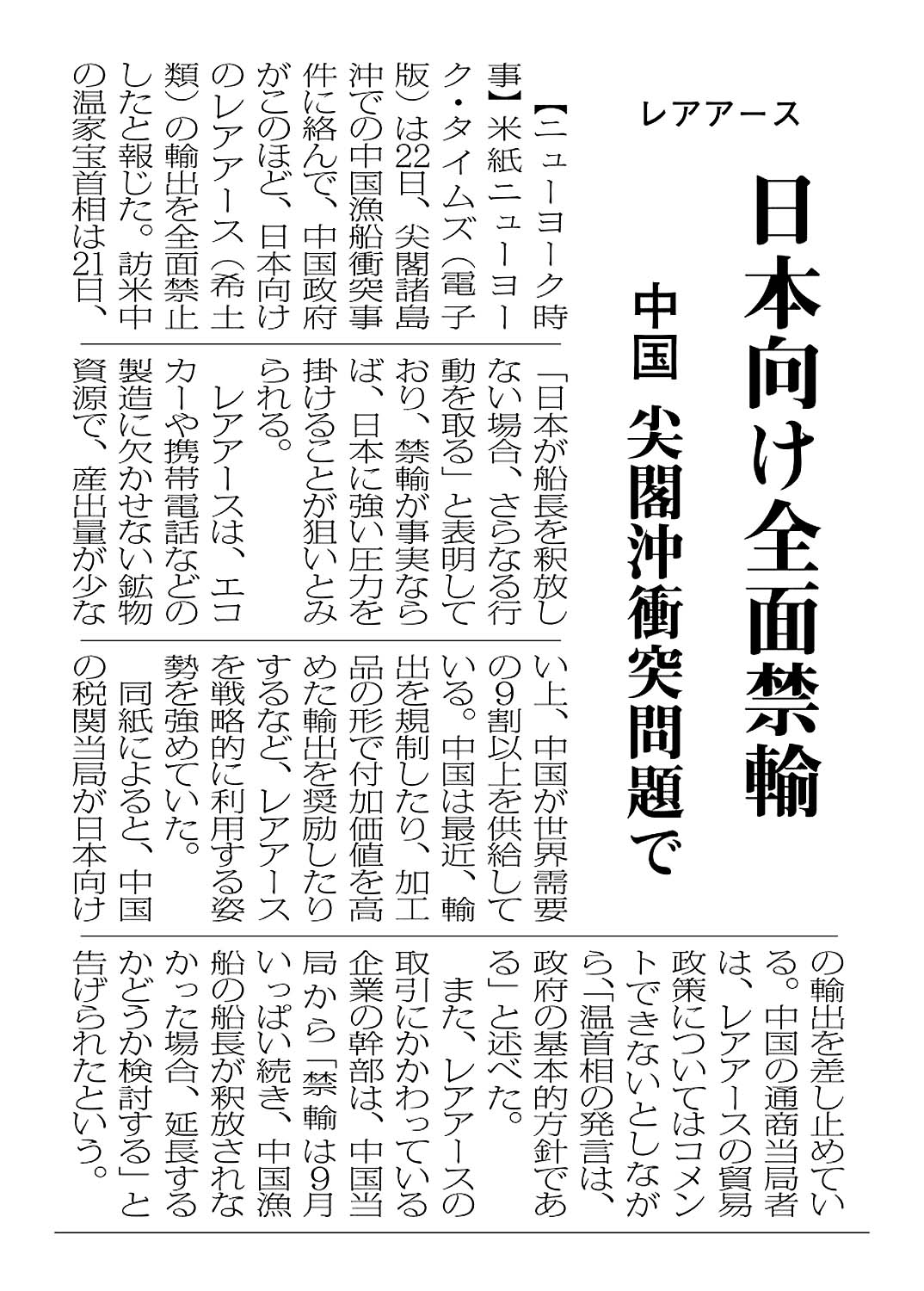 > レアアース/日本向け全面禁輸/中国 尖閣沖衝突問題で: