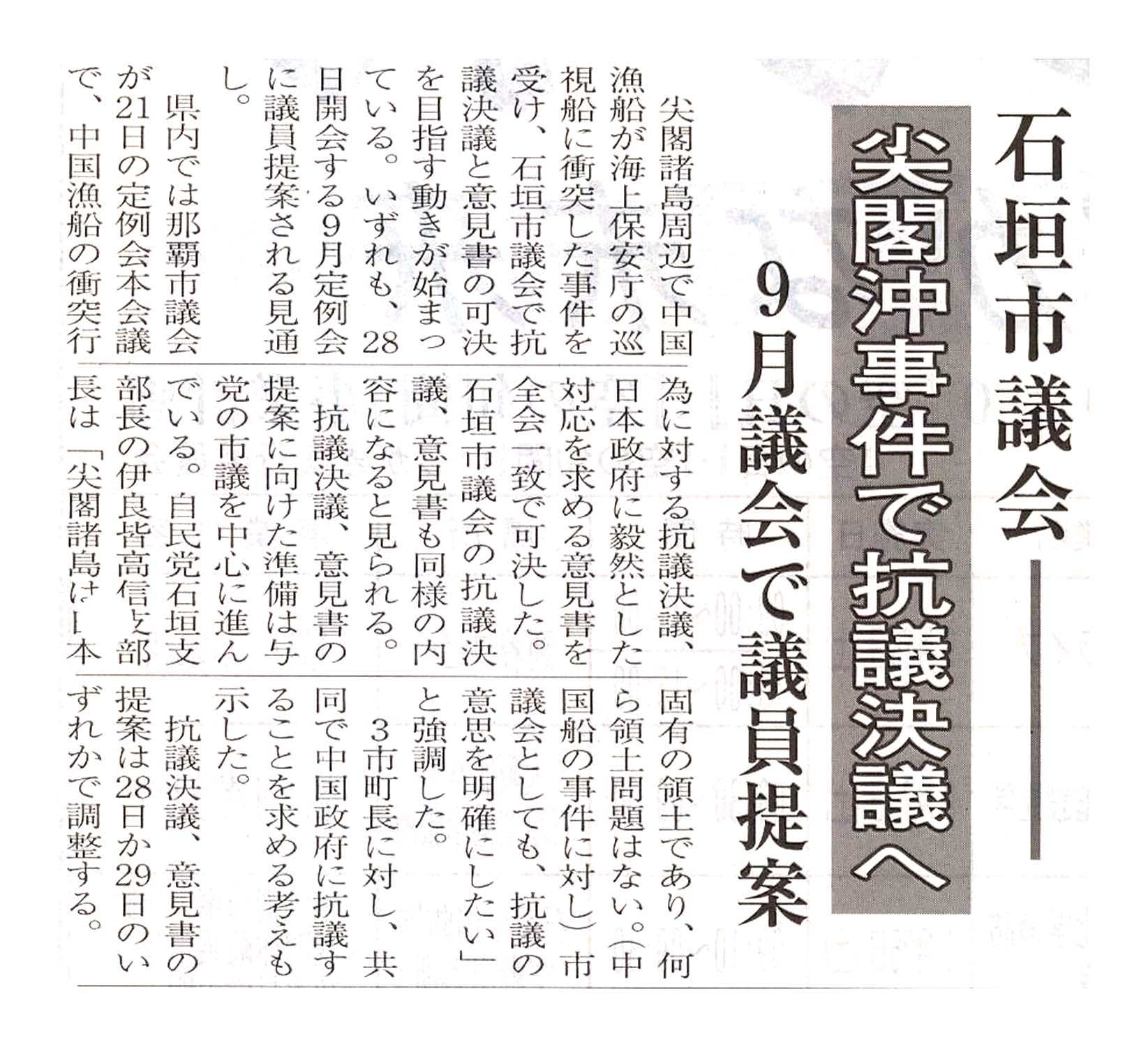 > 石垣市議会 尖閣沖事件で抗議決議へ/9月議会で議員提案 :
